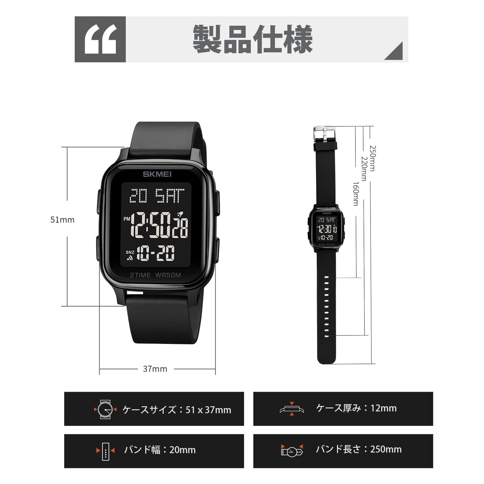 【製品仕様】ケース縦:約51mm 横:37mm、 ケース厚み:約12mm、 バンド幅:約20mm、 バンド長さ:約250mm(最小腕回り約160mm、最大腕回り約220mm、男性や女性でも適用)、 本体重さ:約42g