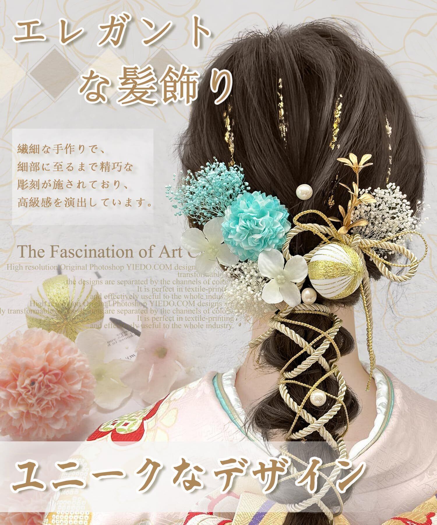「華やかな髪飾り」ゴールド花、かすみ草、金箔、水引の髪飾り14点セットで、ヘアスタイルを華やかに飾ります!特にゴールド花、かすみ草と9色の造花という三種類の花で飾られており、あなたの髪型をより輝かせ、豊かな花の形の髪飾りはヘアスタイルを十分にアプールし、女性らしさを与えています。