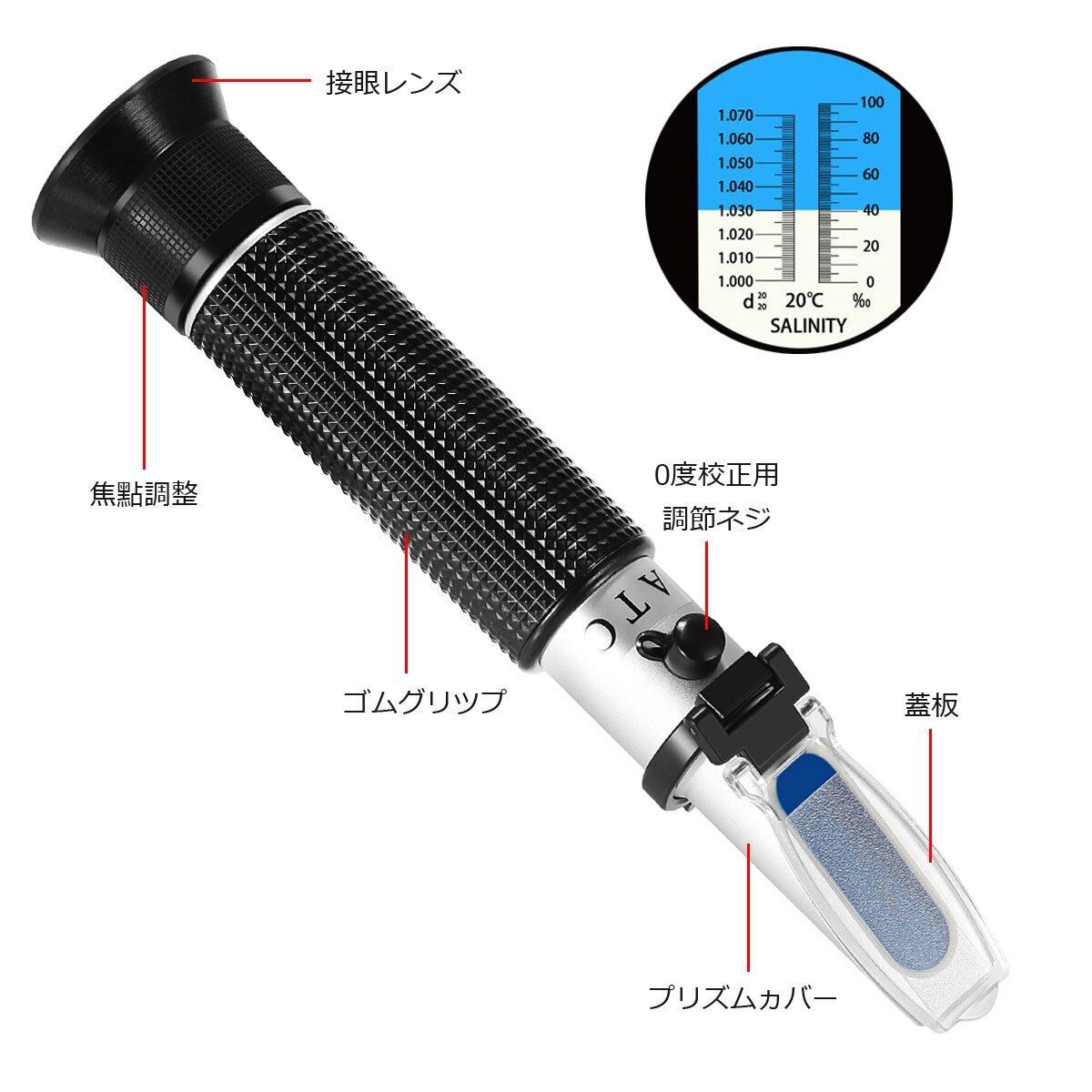 海水比重(測定範囲):1.000~1.070,塩分濃度(測定範囲):0~10%。