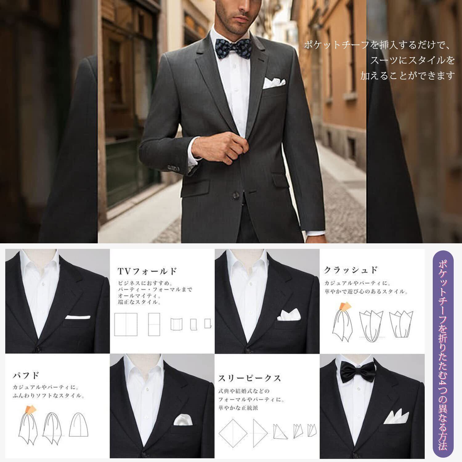 【ポケットチーフ折り方説明オリジナルガイド付き】使える5種のポケットチーフ折り方ガイド付き。初めての方にも安心です。