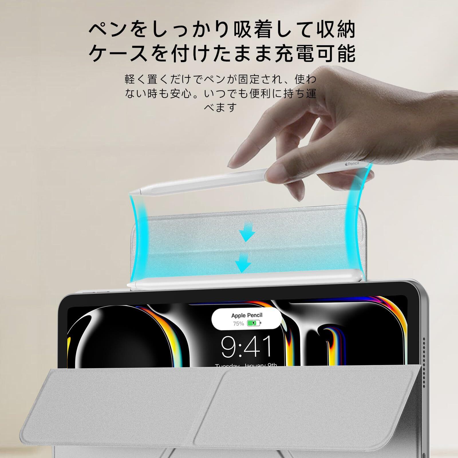 【内蔵式のApple Pencil用ストラップ】隠れたマグネット式ペンシルストラップが、充電中のペンシルをしっかり保持し、外出先での落下を防ぎます。使用しない時はストラップを折りたたんで背面パネルに隠し、ipad pro ケースのミニマルでスマートな外観を保つことができます。
