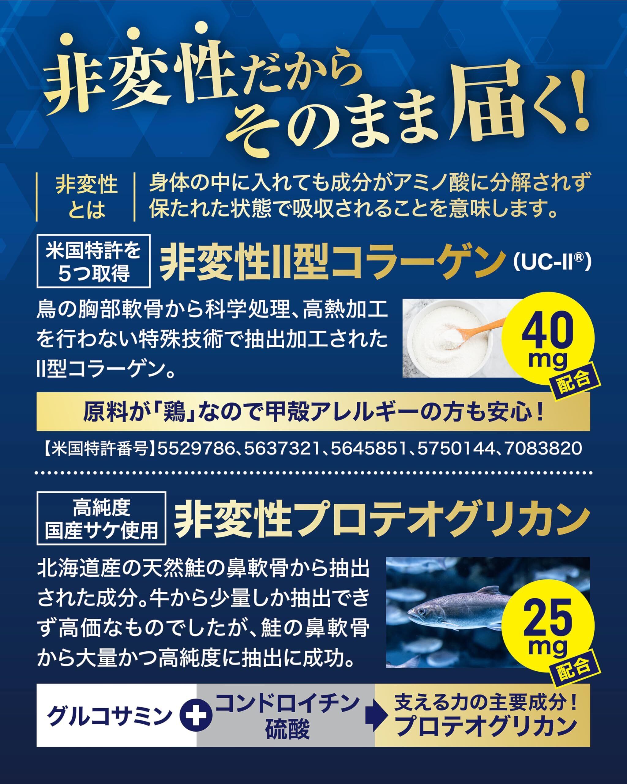 1粒あたりの主要成分含有量非変性Ⅱ型コラーゲン含有鶏軟骨抽出物(UC-Ⅱ):40mg、非変性プロテオグリカン含有サケ鼻軟骨抽出物:25mg