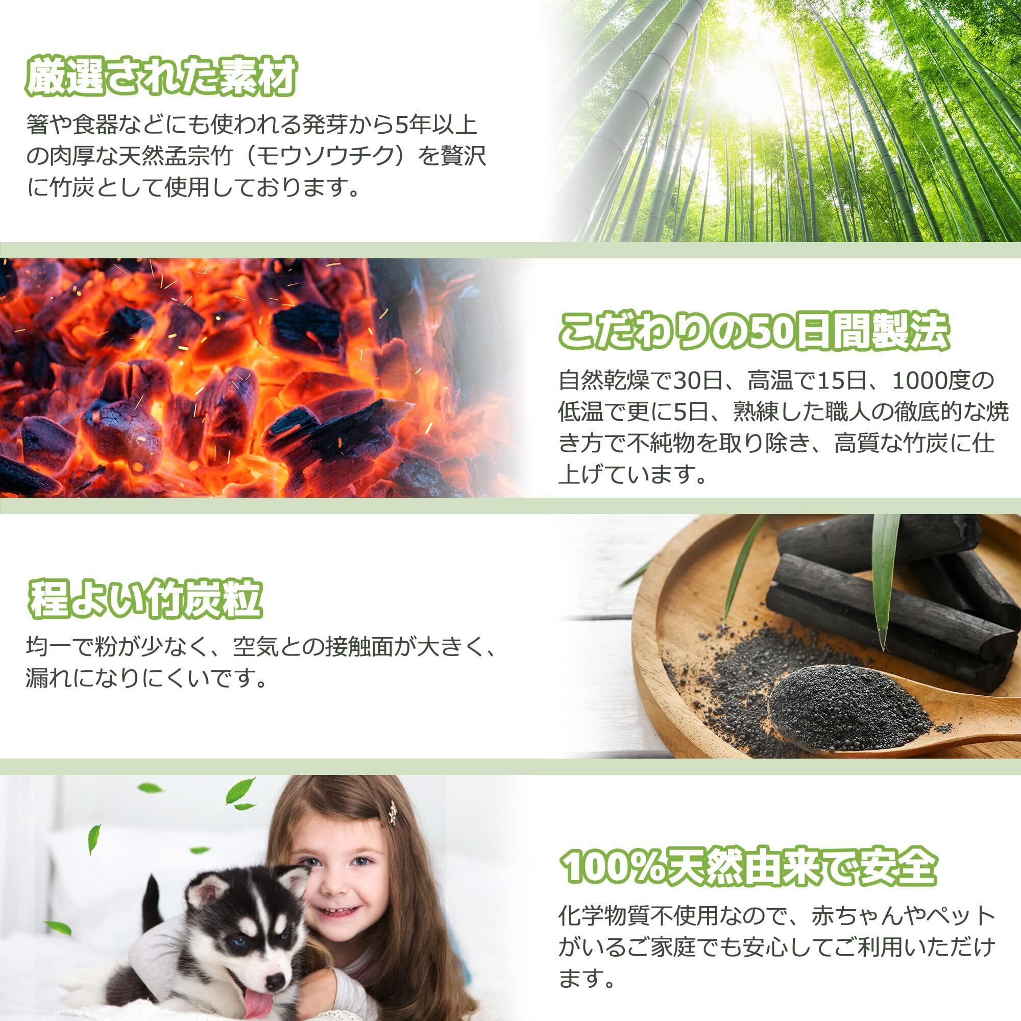 【漏れや着色防止】不織布と麻生地の二重加工袋で包装され、竹炭の劣化粉砕による漏れや着色を避けます。無地かつシンプルなデザインで、使用場所の清潔さをキープしてくれます。また、天日干しをすれば吸収力が回復し、最大二年間繰り返してご使用いただけます。更に、使い終わったら土に撒き、植物の成長を促進して土壌改善効果も期待できます。