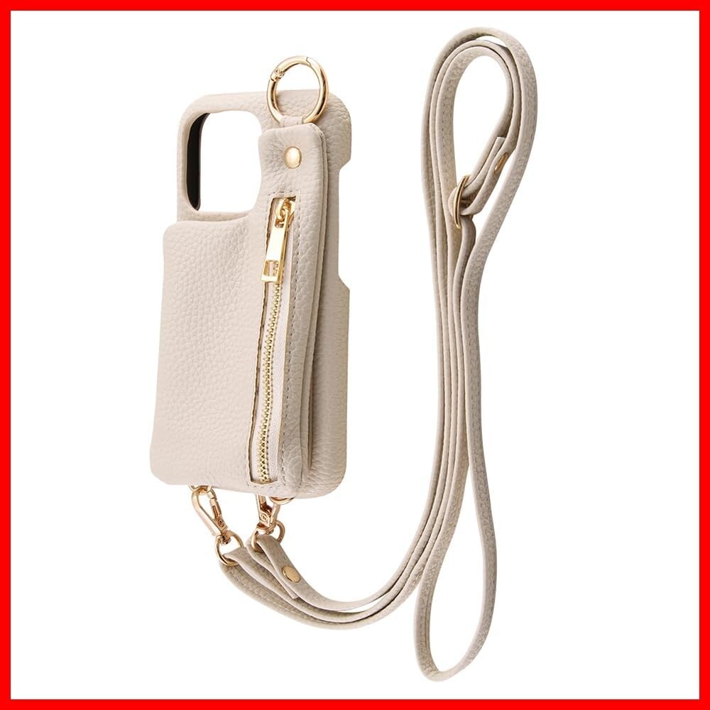 iPhone 15 Pro ケース オープンレザーケース ショルダーストラップ ポーチ付き m1n1 アイボリー