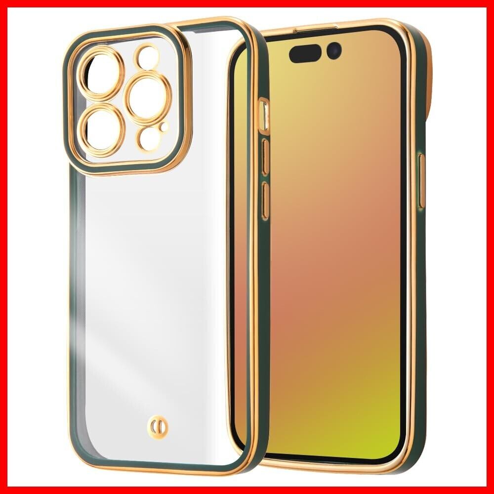 iPhone15 Pro ケース クリア メタル フレーム カメラ保護 耐衝撃 メッキ加工 ストラップホール 付き アイフォン 15 プロ カバー/グリーン/ゴールド