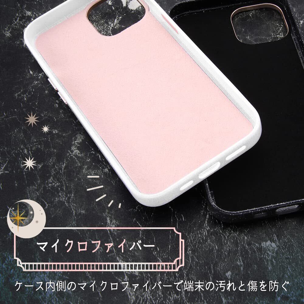 特殊なラメ加工を施したキラキラと綺麗な素材感のケース。サイドボタンやカメラ周りなど統一感のあるメタリックパーツ。内側はやさしく端末を守るマイクロファイバー素材。ラメ塗装ですが表面はツルっとした仕上がりです。メタリックカラーの上に大小ランダムに数色のラメを取り入れてみる角度によって色味、煌めき具合が変わりキラキラと華やかに演出してくれます。