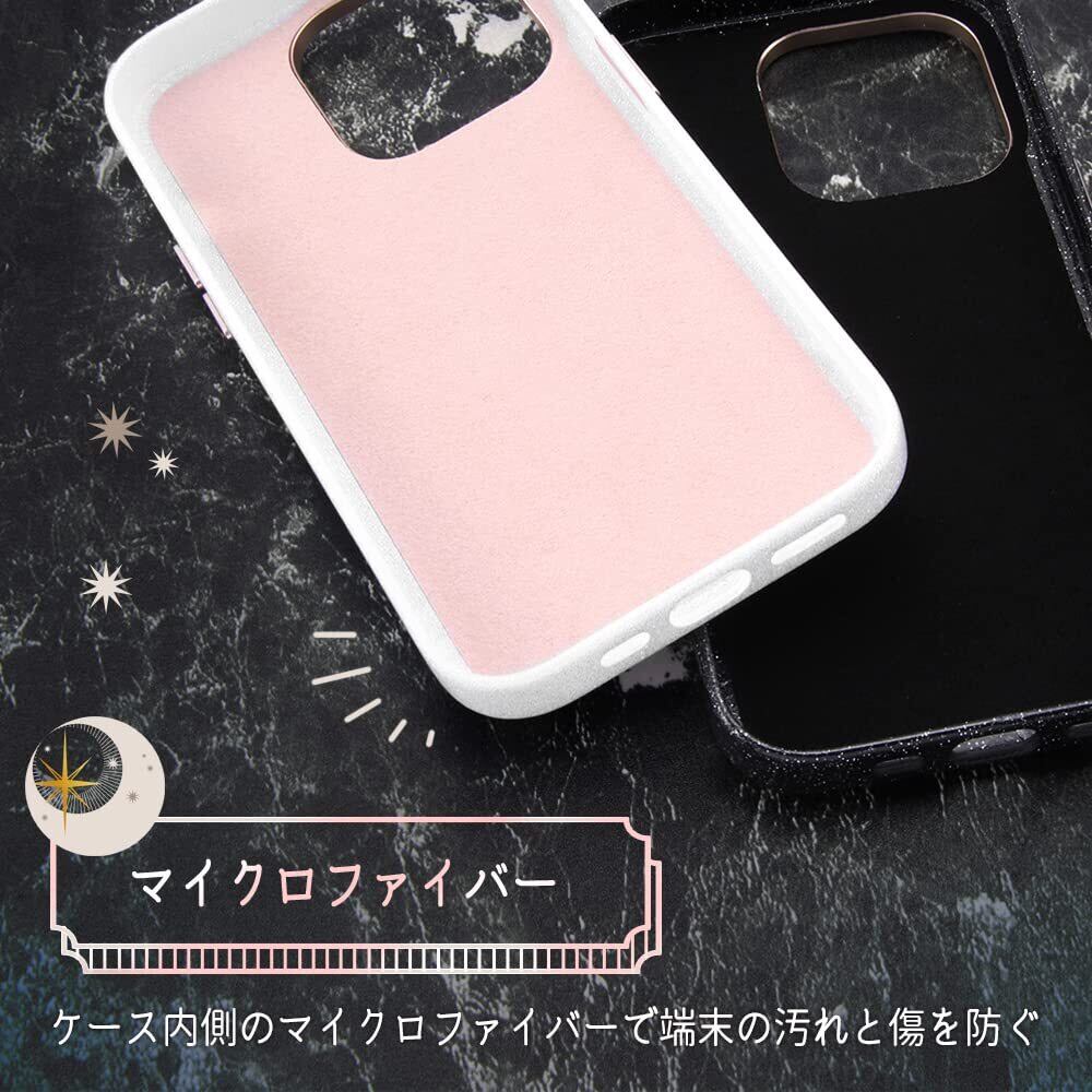 特殊なラメ加工を施したキラキラと綺麗な素材感のケース。サイドボタンやカメラ周りなど統一感のあるメタリックパーツ。内側はやさしく端末を守るマイクロファイバー素材。ラメ塗装ですが表面はツルっとした仕上がりです。メタリックカラーの上に大小ランダムに数色のラメを取り入れてみる角度によって色味、煌めき具合が変わりキラキラと華やかに演出してくれます。