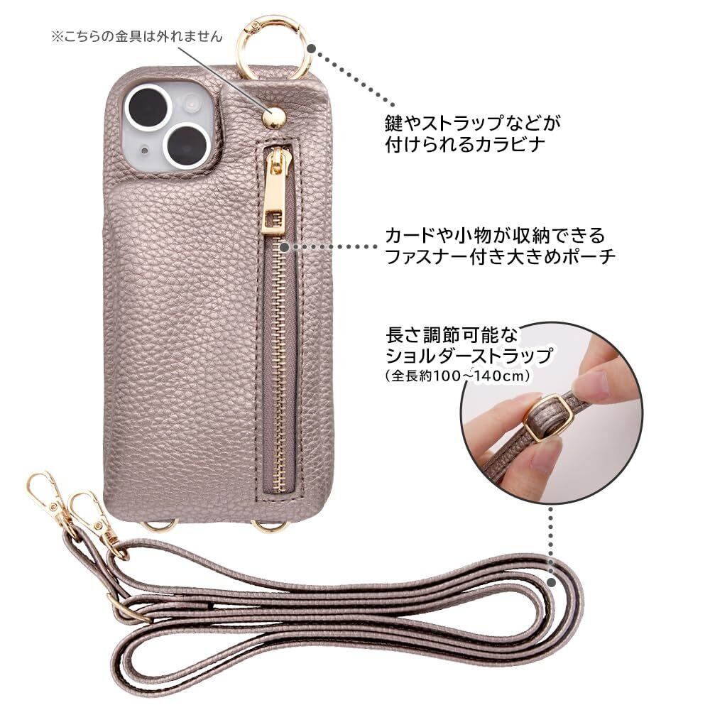 カードやリップなどが入る便利なポーチ付き!。ポーチはスタンドとしても使用可能。ショルダーストラップは長さ調整が可能。