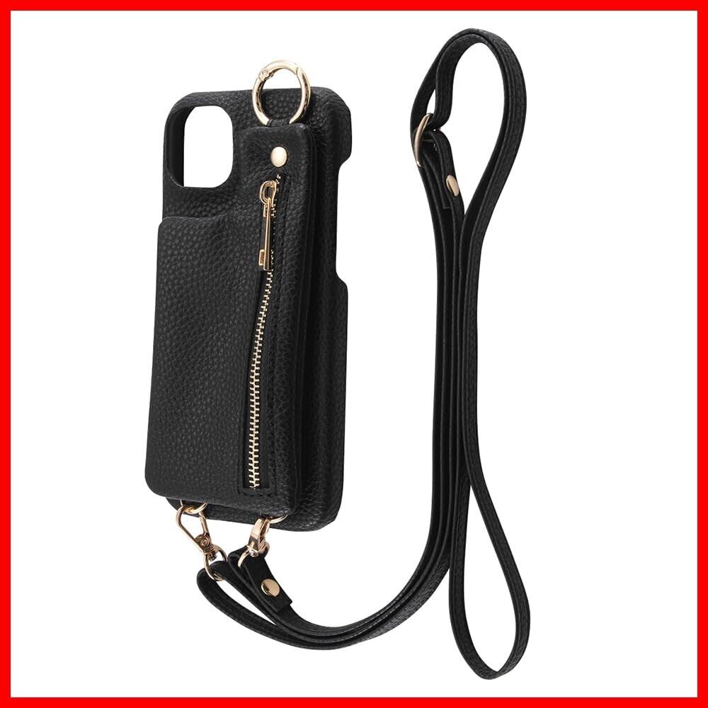iPhone 15 Plus ケース オープンレザーケース ショルダーストラップ ポーチ付き m1n1 ブラック