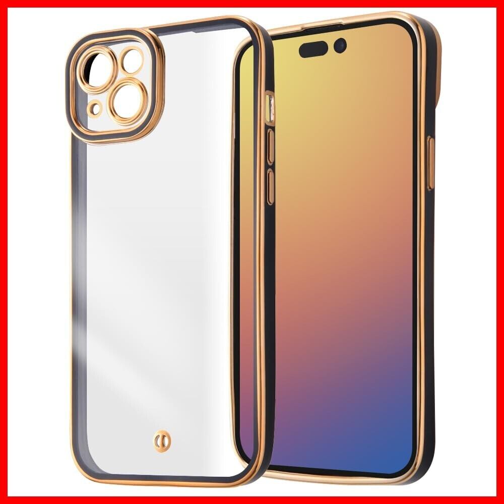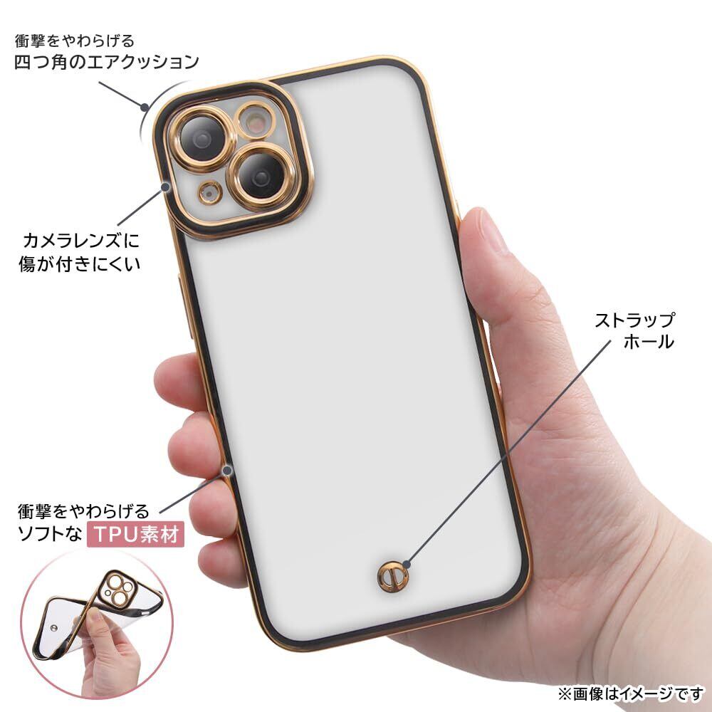 iPhone15 Plus ケース クリア メタル フレーム カメラ保護 耐衝撃 メッキ加工 ストラップホール 付き アイフォン 15 プラス カバー/ブラック/ゴールド