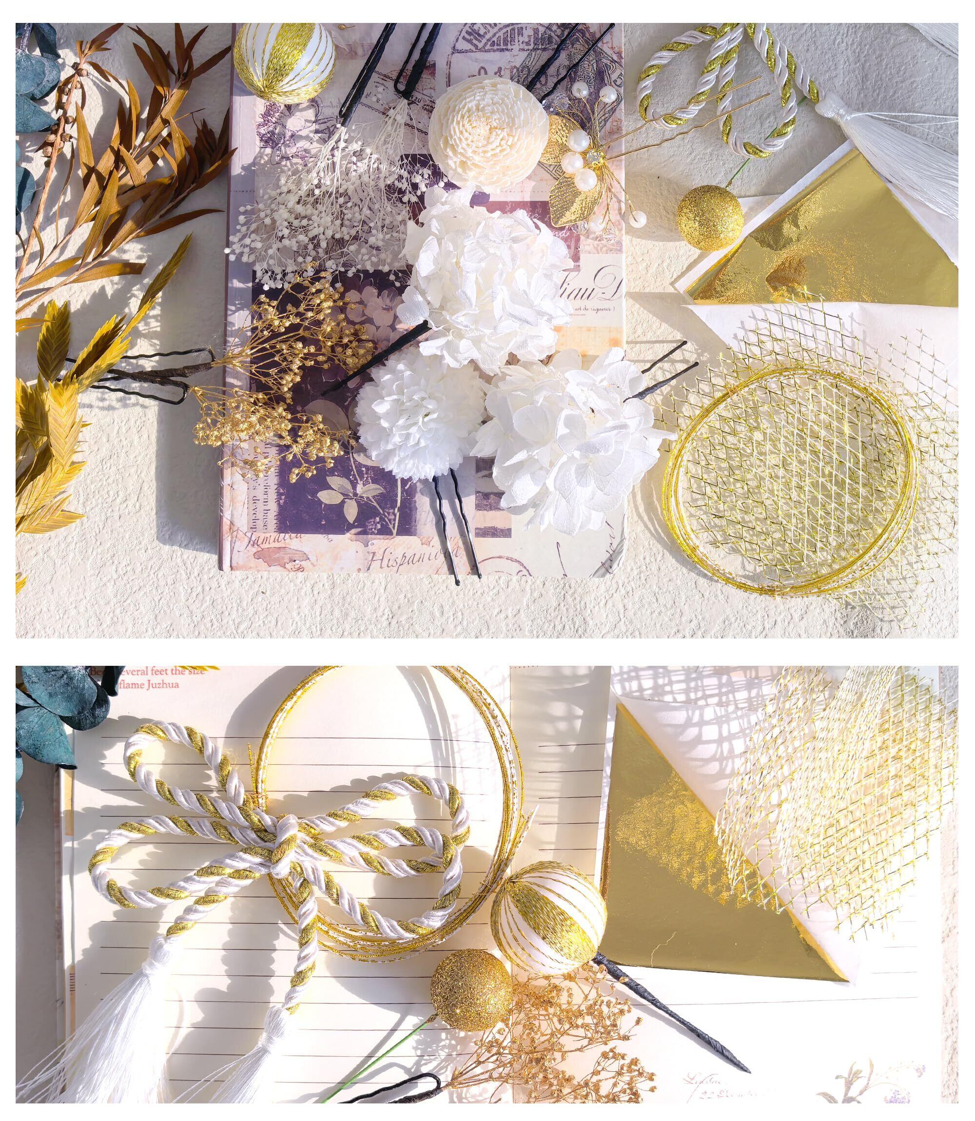 【選び抜かれた素材】髪飾りの素材は高品質なドライフラワーと装飾を使用しており、耐久性と美しさを兼ね備えています。金の装飾は高尚で華やかな印象を与え、全体に贅沢感を加えます。白のドライフラワーは軽やかさと柔らかさを加え、華やかさの中に優雅さを失わず、上品さを保ちます。花弁の紋理から金属装飾の輝きまで、職人の秀逸な技量が感じられます。