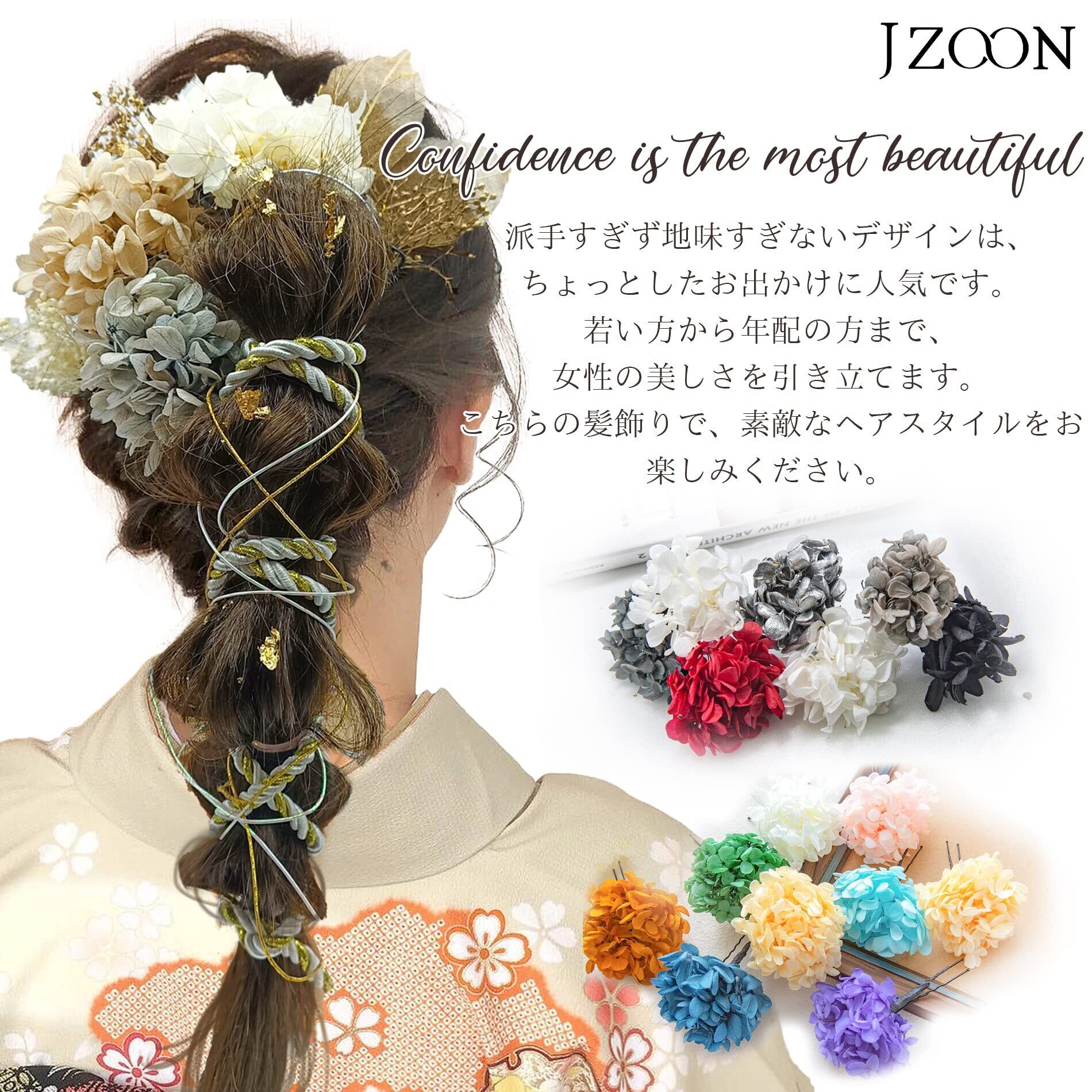 【上品な髪飾りセット】合計で25点の上品な髪飾りで、11色がをご選択いただけます。ア ジサイ、水引、かすみ草、金箔を散りばめ、その他葉っぱと組紐の合わせて、ボリューム感や 色彩のバランスよく、女性の美しさをアピールできます。エレガントに溢れる髪飾りで重要な 日を誰よりも輝いています。
