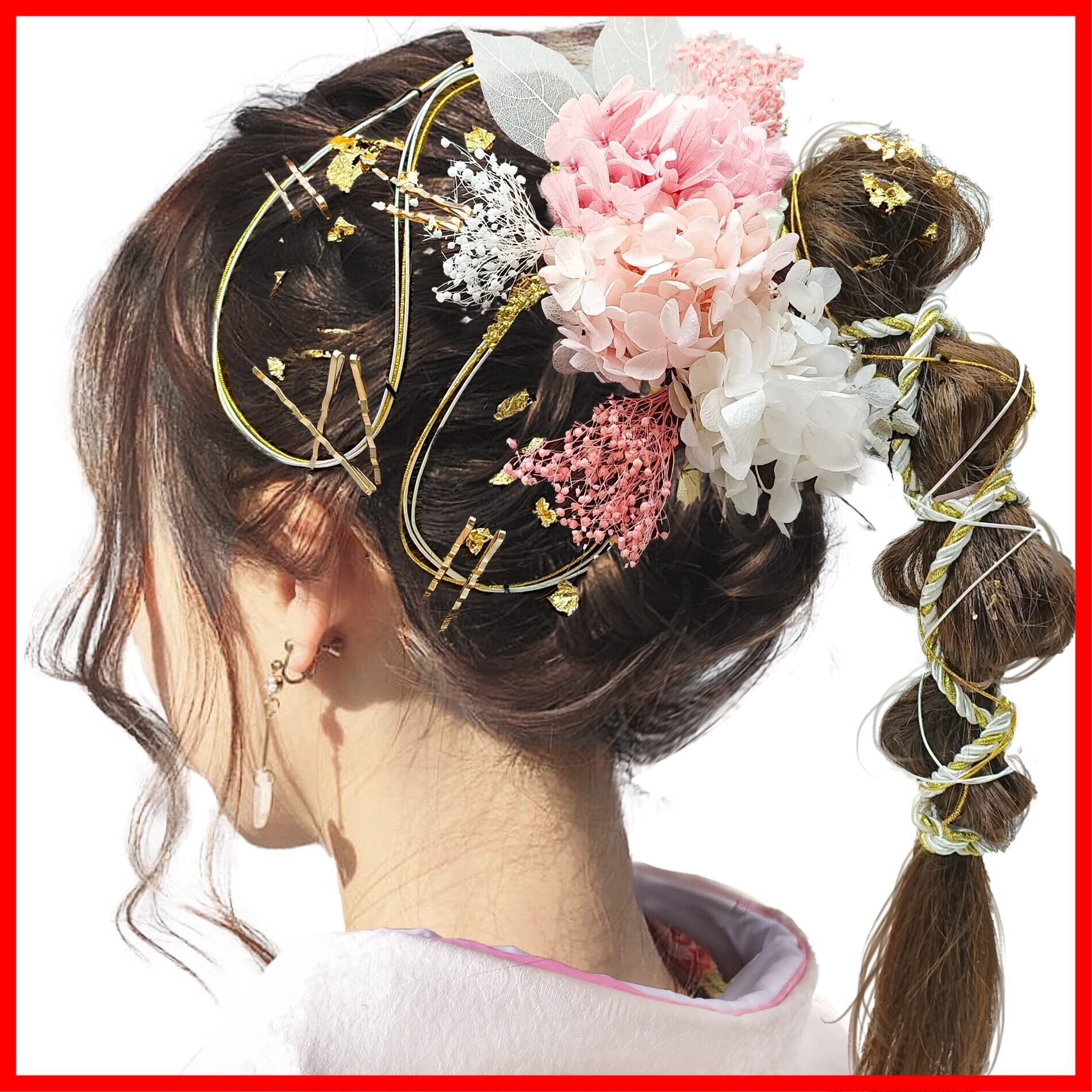 【多様性】 水引とゴールドピンが入れ、画像のポニーテール写真のように使用でき、他のドラ イフラワーをセットして利用も可能で、お好きなスタイルに従って、カスタマイズいただけま す