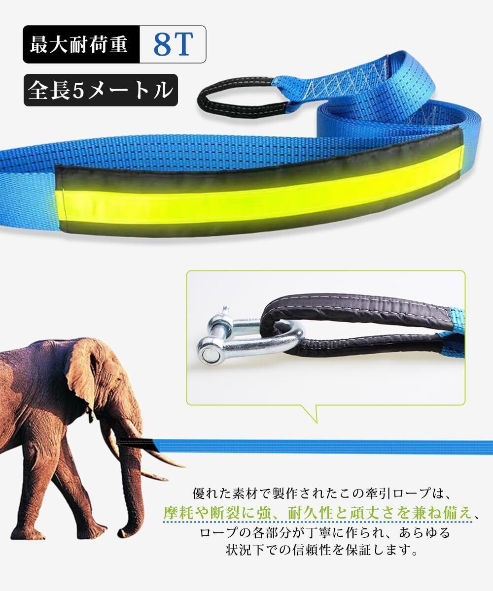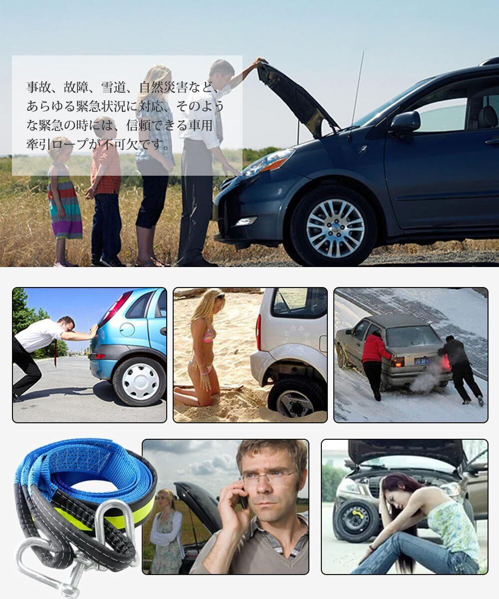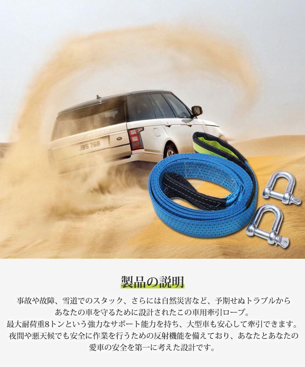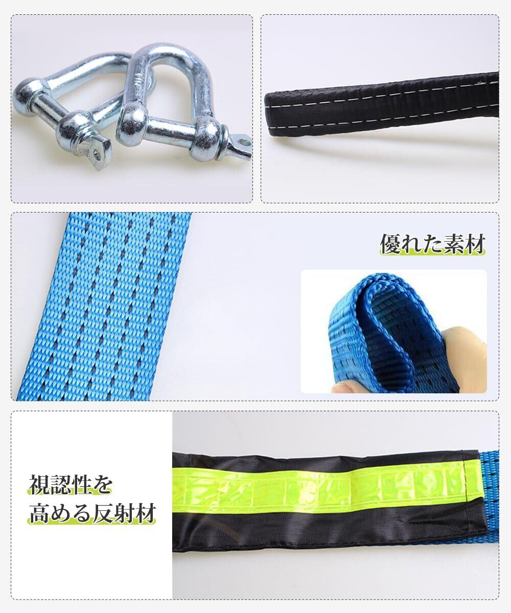牽引ロープ 車用牽引ロープ 汎用牽引ロープセット 車用牽引ロープ 緊急ロープ けん引ロープ U字シャックルフック式 牽引 頑丈 耐久性 高強度 夜間反射 緊急脱出対策 事故/故障/雪道/自然災害 最大耐荷重9トン 長さ5m