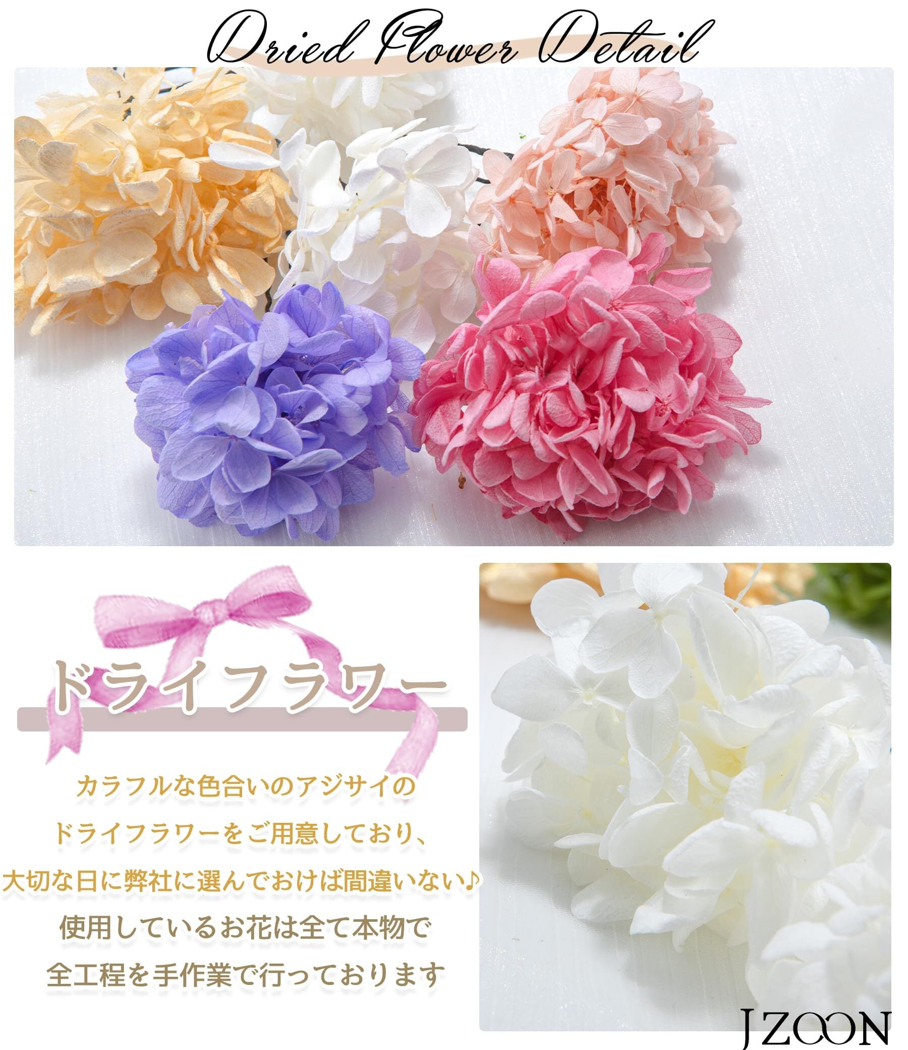 髪飾りのドライフラワーは天然素材ので、サイズや形や色味が商品異なる可能性があります。また、モデルの頭部と生身の頭はサイズが少し違いますので、購入前にサイズをご確認ください。