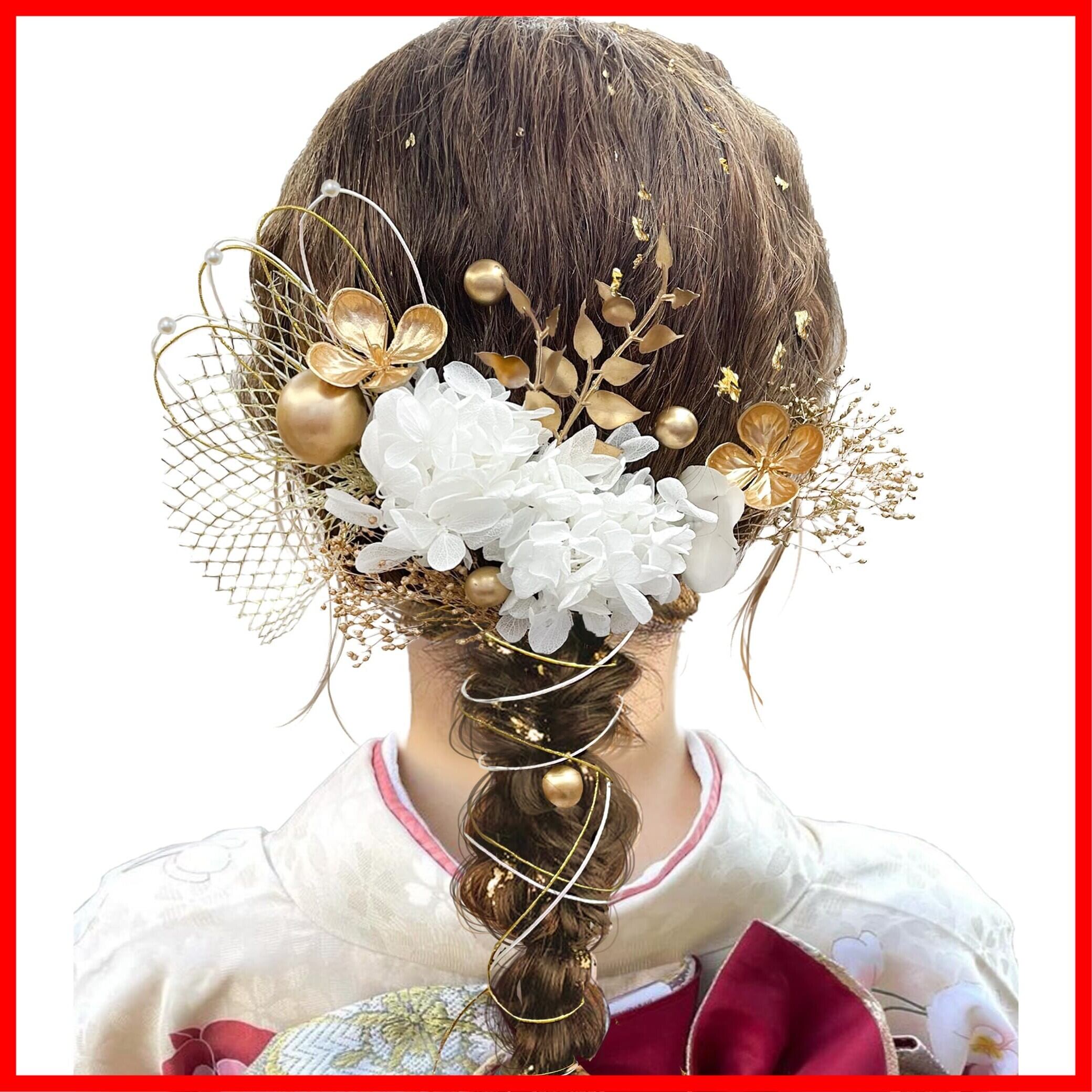 髪飾り 【9色展開】 成人式 卒業式 振袖 和装 着物 袴 浴衣に 七五三 ドライフラワー 金箔 和玉 組紐 水引き かすみ草 網型飾り 専用ケース付き A1101