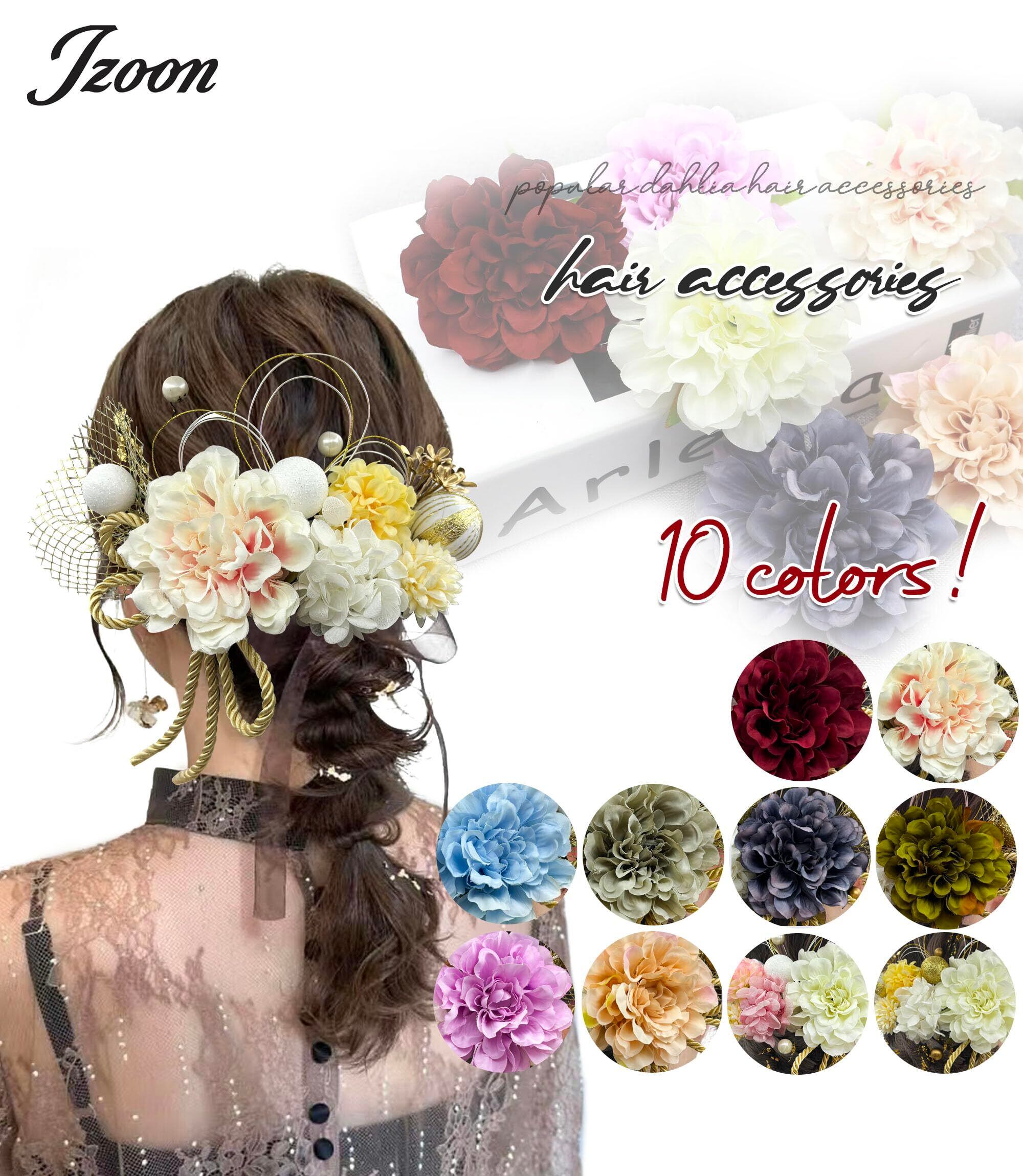 【優しいイメージ】厳選の天然素材を贅沢に使い、ポンポンと立体感のあるダリアを10色ご用意しております。ハレの日のお服や気分に合わせてご自由にお選びいただけます。どれもキレイな発色でヘアメイクに華を添え、優しい雰囲気になります。
