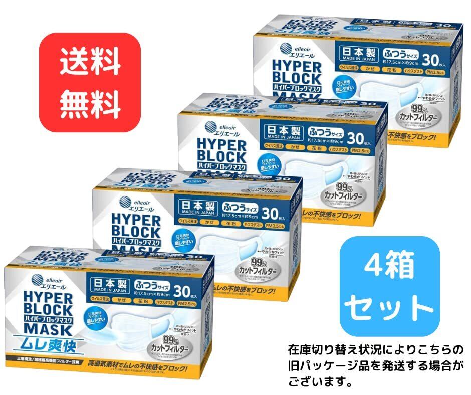 [エリエール] 4個セット 大王製紙 マスク 日本製 不織布 息しやすい ウイルス飛沫対策 ハイパーブロックマスク ムレ爽快 30枚 ふつうサイズ 特製ポケットティッシュ付き ホワイト
