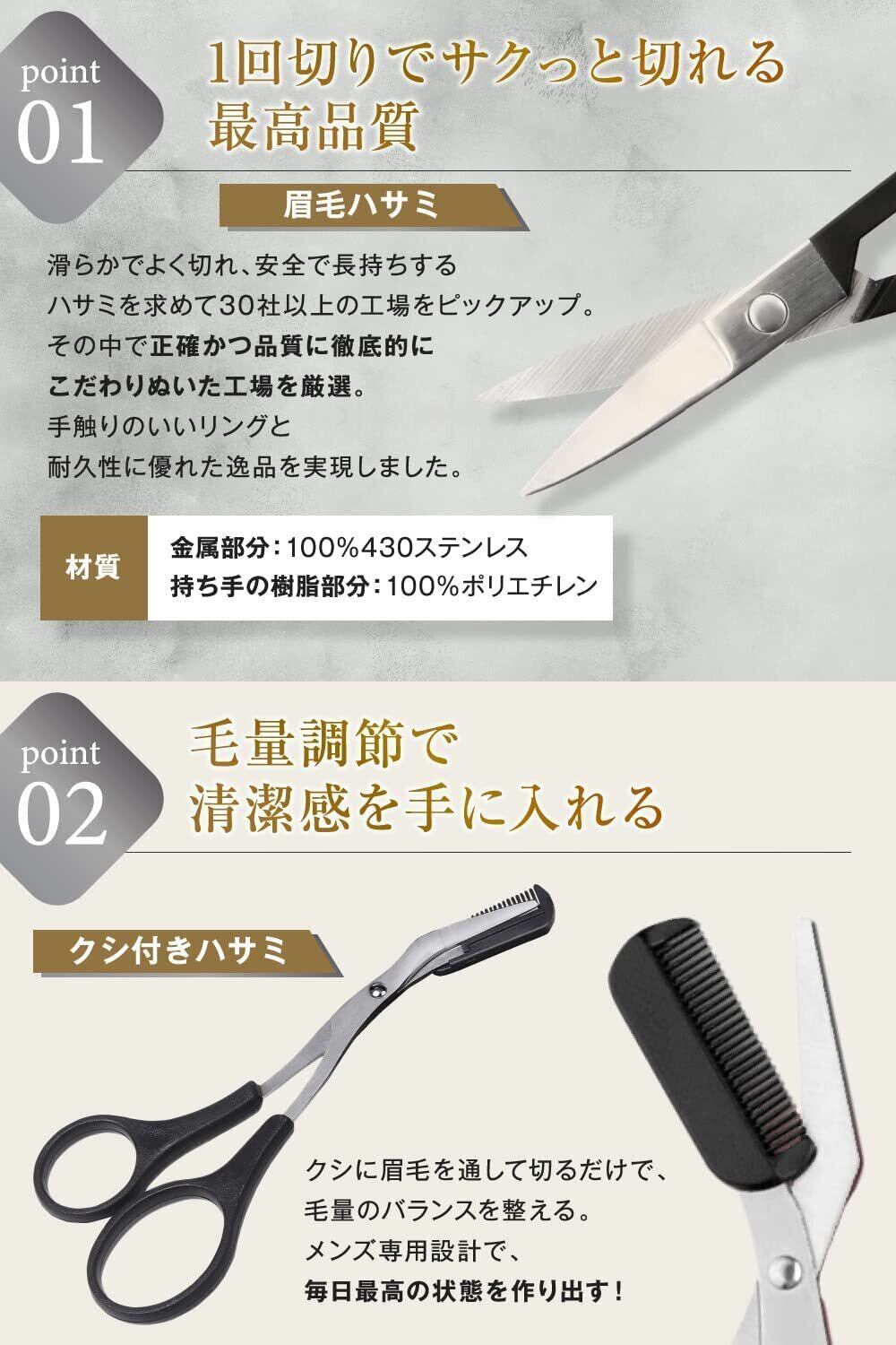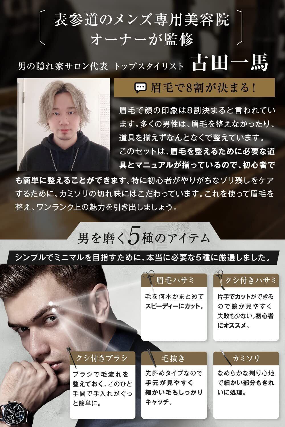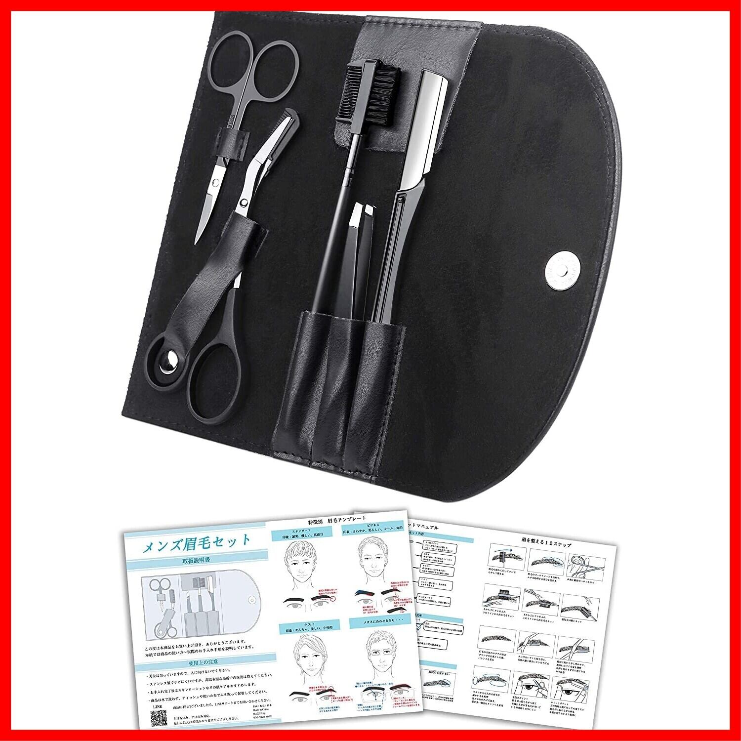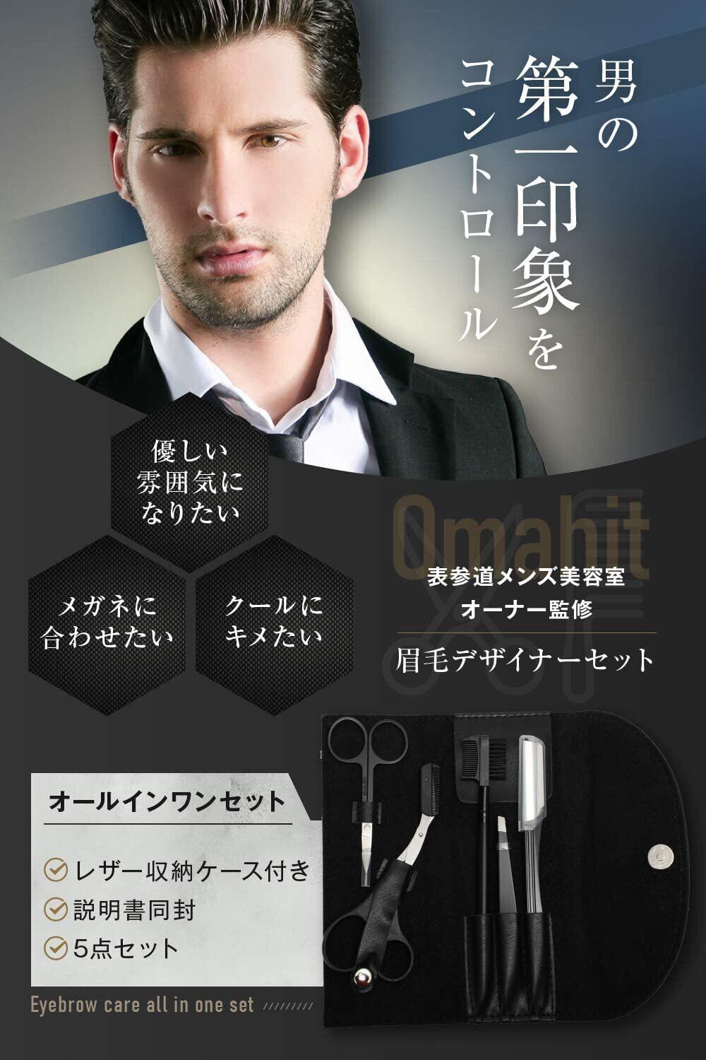 [Omahit] 眉毛 ハサミ はさみ メイクアップセット 眉毛剃り 毛抜き くし 顔剃り メンズ 説明書付 表参道メンズ美容師監修 (ブラック)