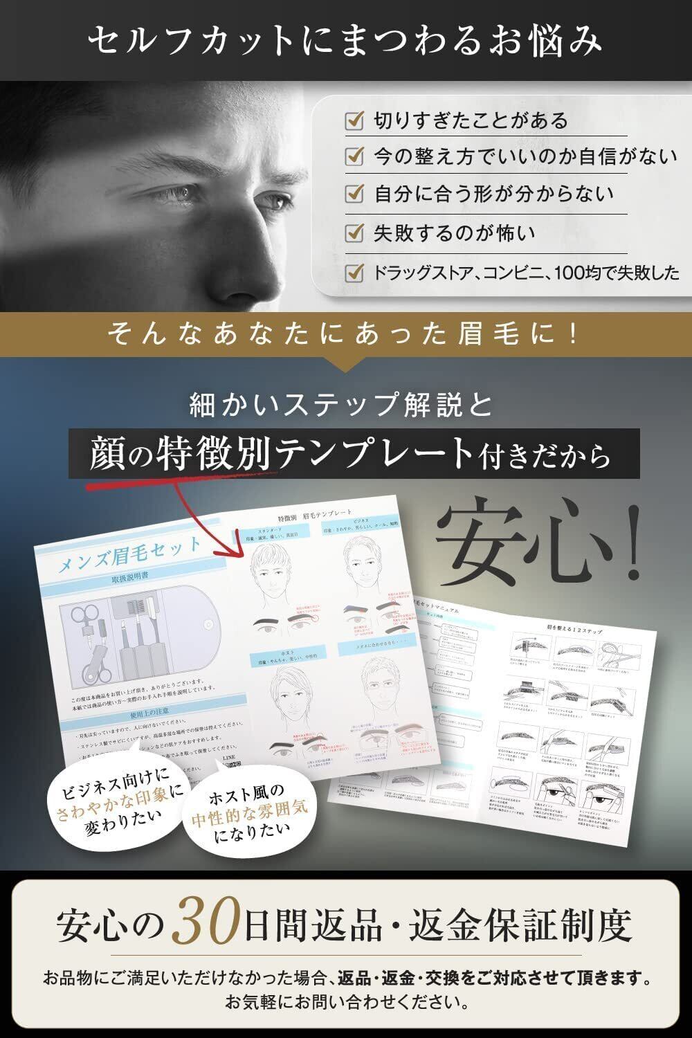【顔の特徴別テンプレート付き】ビジネス向けにさわやかな印象、ホスト風の中世的な雰囲気など、顔に合わせてピッタリの眉毛を説明書で解説。