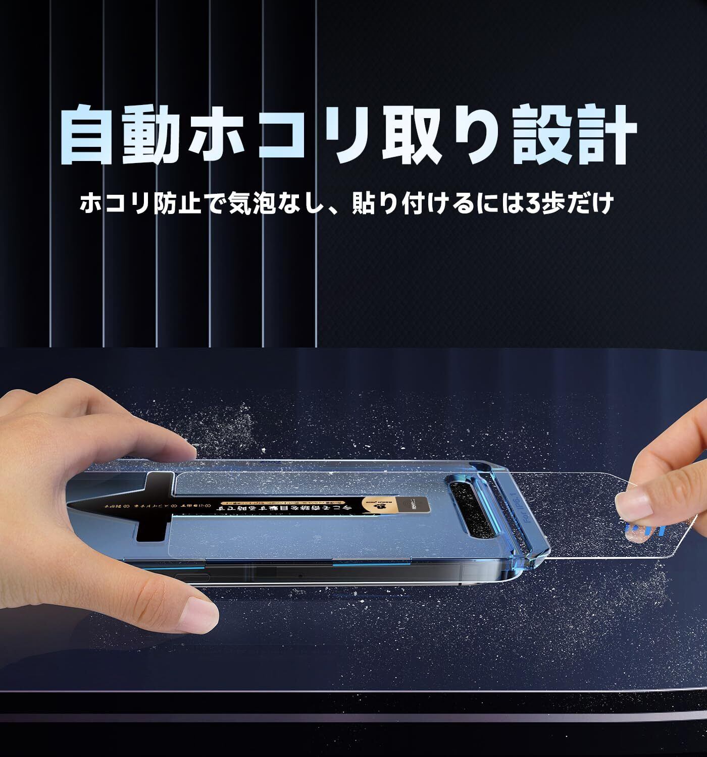 【もう失敗はしない】本製品はiPhone13/13pro/14に対応するガラスフィルム2枚セットです。百万以上の欧米ユーザーのフィドバックを集めて日々改善したガイド枠は、3歩だけで保護フィルムを貼り付けます。そのうえ、自動ホコリ取りデザインだけでなく、ガイド枠のスロープデザインで、空気を順序に取り除くことができて、初心者でも気泡レスのまま綺麗に貼れます。