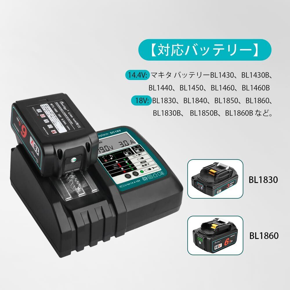 【対応バッテリー】マキタ バッテリーBL1430、BL1440、BL1450、BL1460、BL1830、BL1840、BL1850、BL1860、BL1430B、BL1460B、BL1830B、 BL1850B、BL1860B など充電可能です。