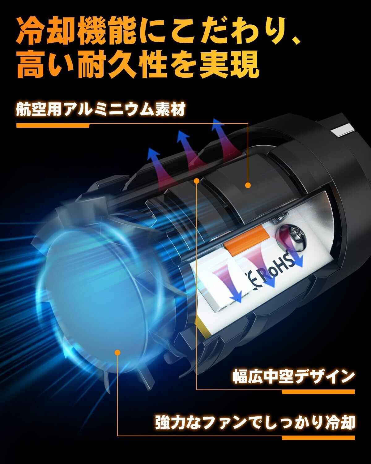 【放熱効果抜群&長寿命】OXILAM ウインカー バルブは航空用アルミ素材と冷却ファン付きで放熱効果抜群。さらに、4つの広範な凹型中空設計により、冷却面積を広げました。バルブやLEDチップから発生する熱を効率良く逃し、寿命を最大限伸ばすことができます。LEDの性能を十分確保でき安定した発光が可能です。
