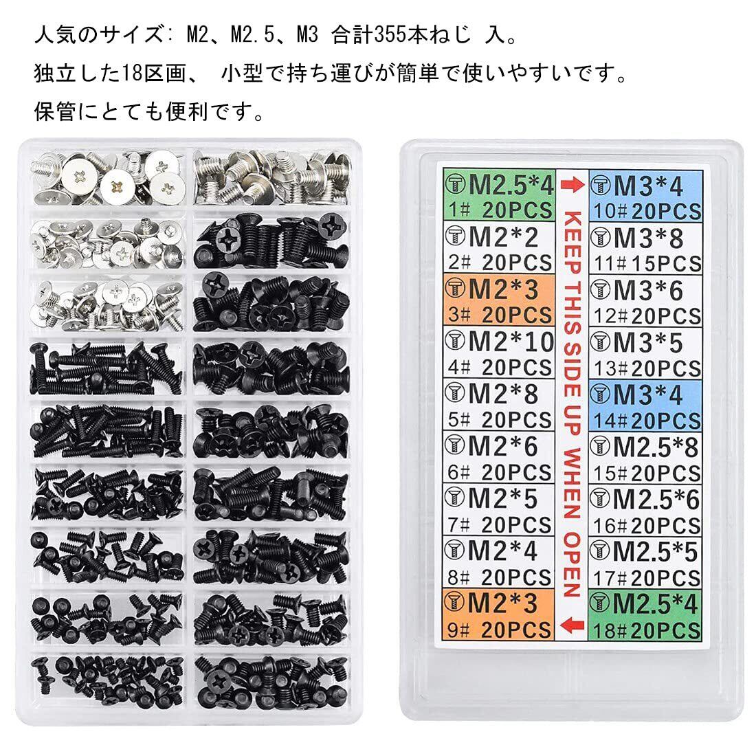 PC ネジセット 355本入り M2 M2.5 M3 ノートPC用ネジ HDD M.2 SSD 固定用平ネジセット 交換用ノートパソコンねじ 収納ケース付き