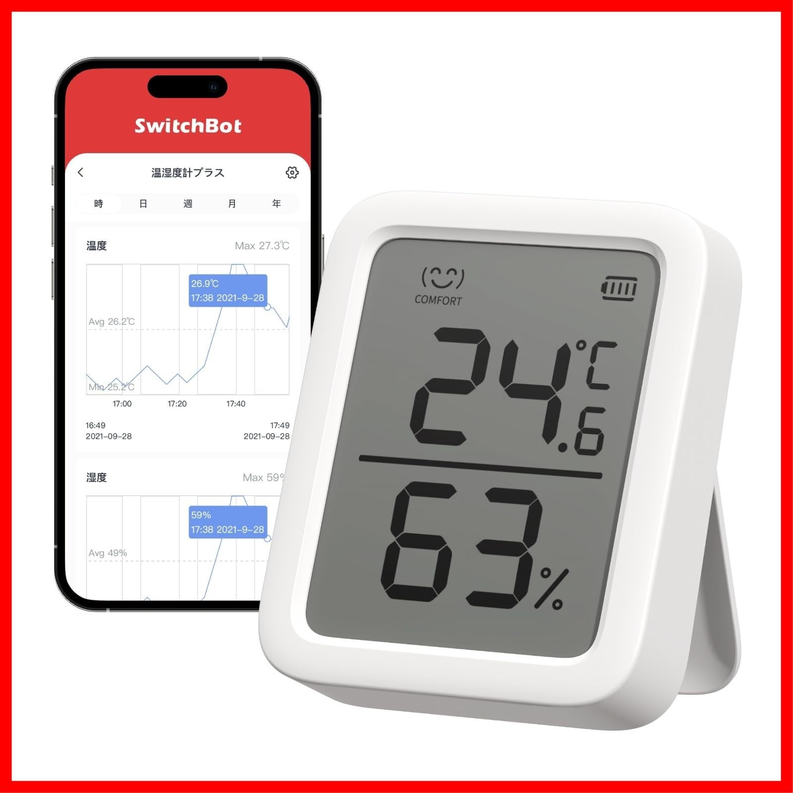 SwitchBot 温湿度計プラス Alexa 温度計 湿度計 - スイッチボット スマホで温度湿度管理 デジタル 高精度 コンパクト 大画面 温度 湿度 アラーム 顔マーク グラフ記録 スマートホーム 梅雨 Alexa Google Home IFTTT イフト Siriに対応(ハブ必要)