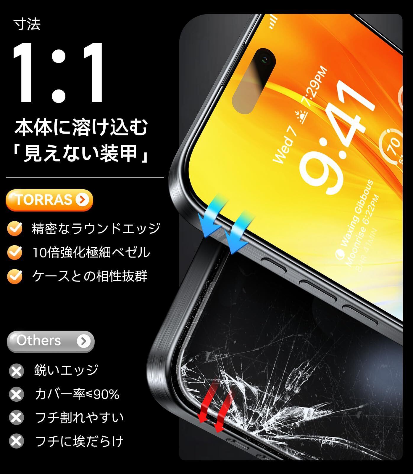 超二重強化ガラス、硬度9H越え、縁まで全面保護、圧倒的な耐衝撃性、自動除塵、スムースタッチ、撥水、防水、抜群な透明感、強光反射を制御、気泡ゼロ、素人でも簡単に装着できる、目をつぶっても貼れる、気泡レス、光…