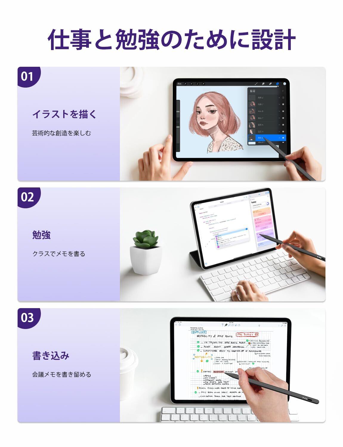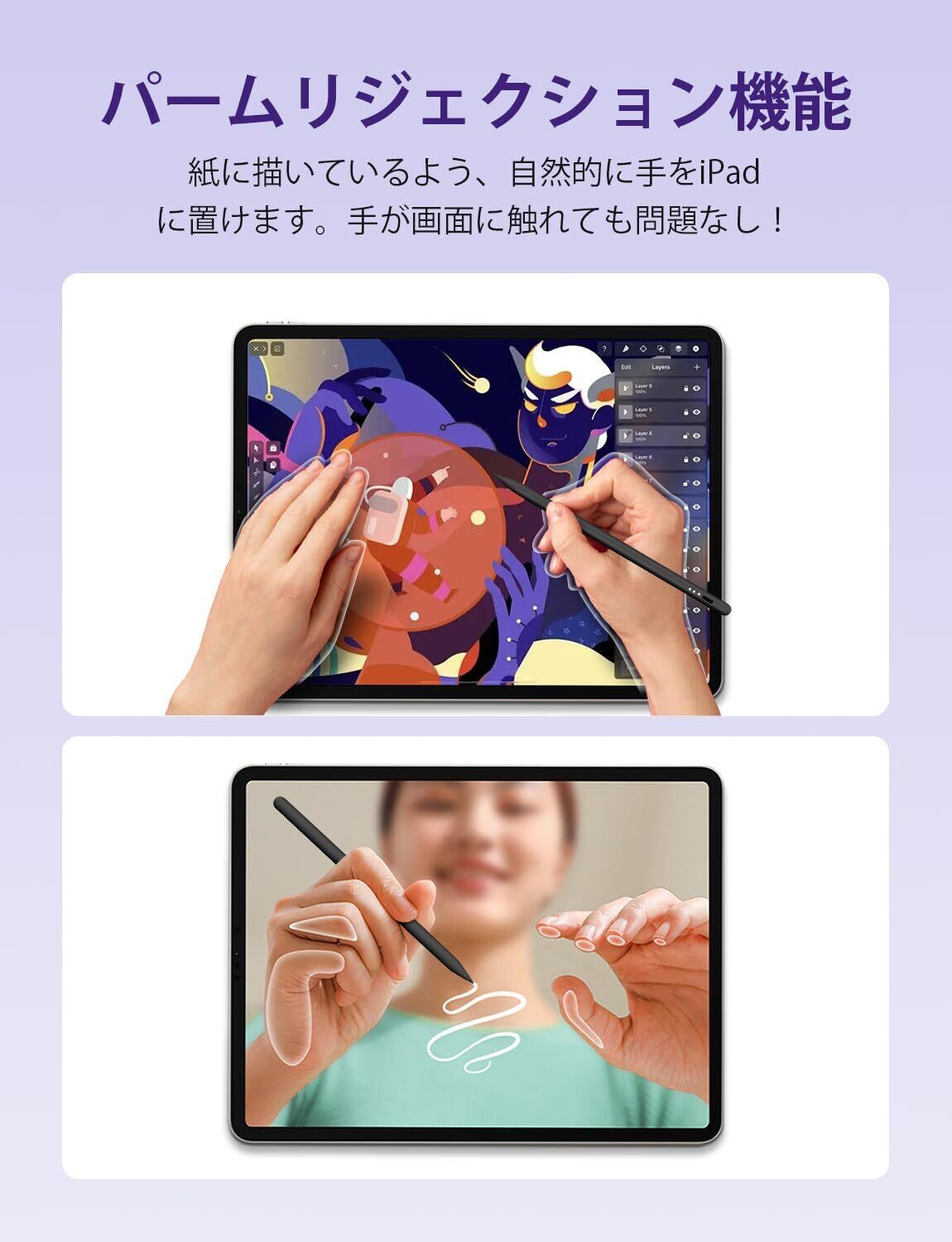 【誤認識防止&磁気吸着機能】パームリジェクション機能も搭載されており、画面に手が触れた状態でも文字を書いたり絵を描いたりできる。また、磁気吸着機能が付いているため、対応するiPadの側面にマグネットでくっつけて運ぶこともできます。(対応可能な型番:iPad mini 6、iPad Pro 12.9インチ(第3/4/5/6世代)、iPad Pro 11インチ(第1/2/3/4世代)、iPad Pro 11/13インチ(M4)、iPad Air(第4世代/第5世代)、iPad Air 11/13インチ (M2/M3)、iPad(10/11(A16)世代)。