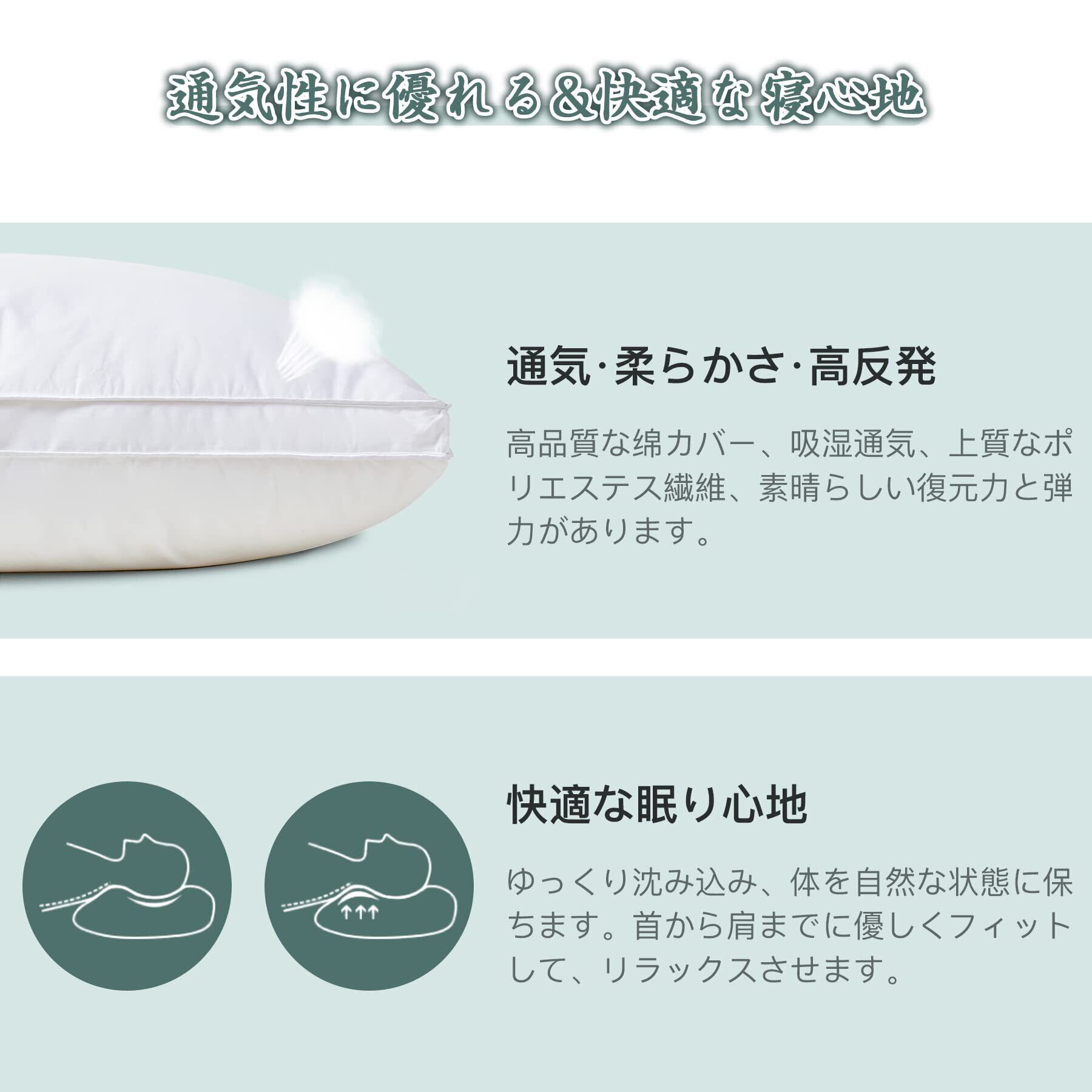 【立体構造】柔らかさと高反発性を兼ね備えた構造であり、ボリューム感よく、羽毛のように叩けばふわーっと飛 び散る性質をもっています。適度な復元力と弾力があり、しっかりと頭を支え、お好きな寝姿でぐっすり眠れます。