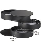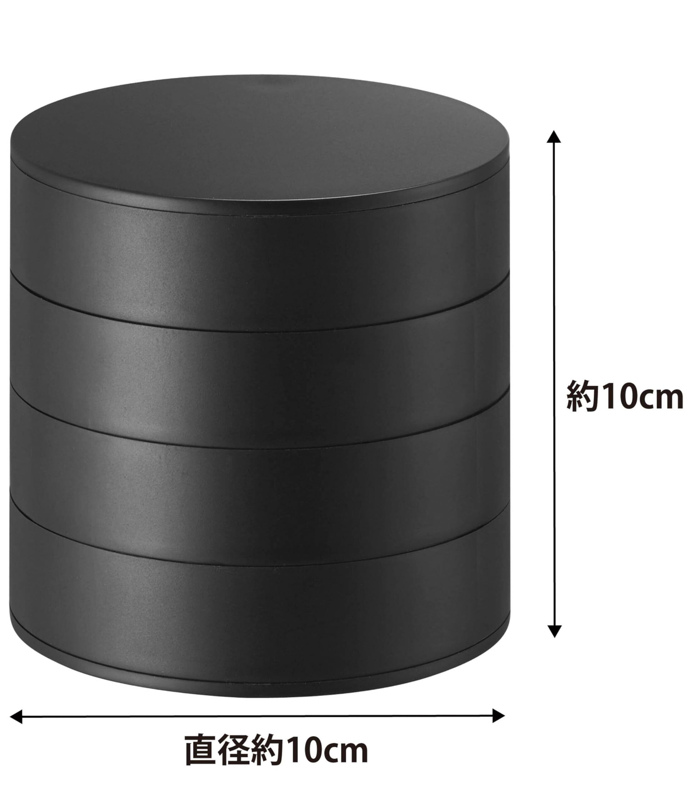 スタイリッシュなtowerシリーズの、4段式のアクセサリートレー。 回転式のデザインなので取り出しやすく、アクセサリーやコスメ、腕時計などをアイテム別に収納できます。 シンプルでシックなデザインなので、男性のアクセサリー入れとしてもお使いいただけます。 ・トレーは回転式。必要な段のトレーだけをスライドさせて取り出すことができます。 ・使わない際にはコンパクトに収納でき、ほこりがたまりにくい機能的なデザイン。 ・アクセサリーを傷つけないフェルトマット付き。 ・軽くてお手入れがしやすいABS樹脂製。 ・ホワイト・ブラックの2色からお選びいただけます。