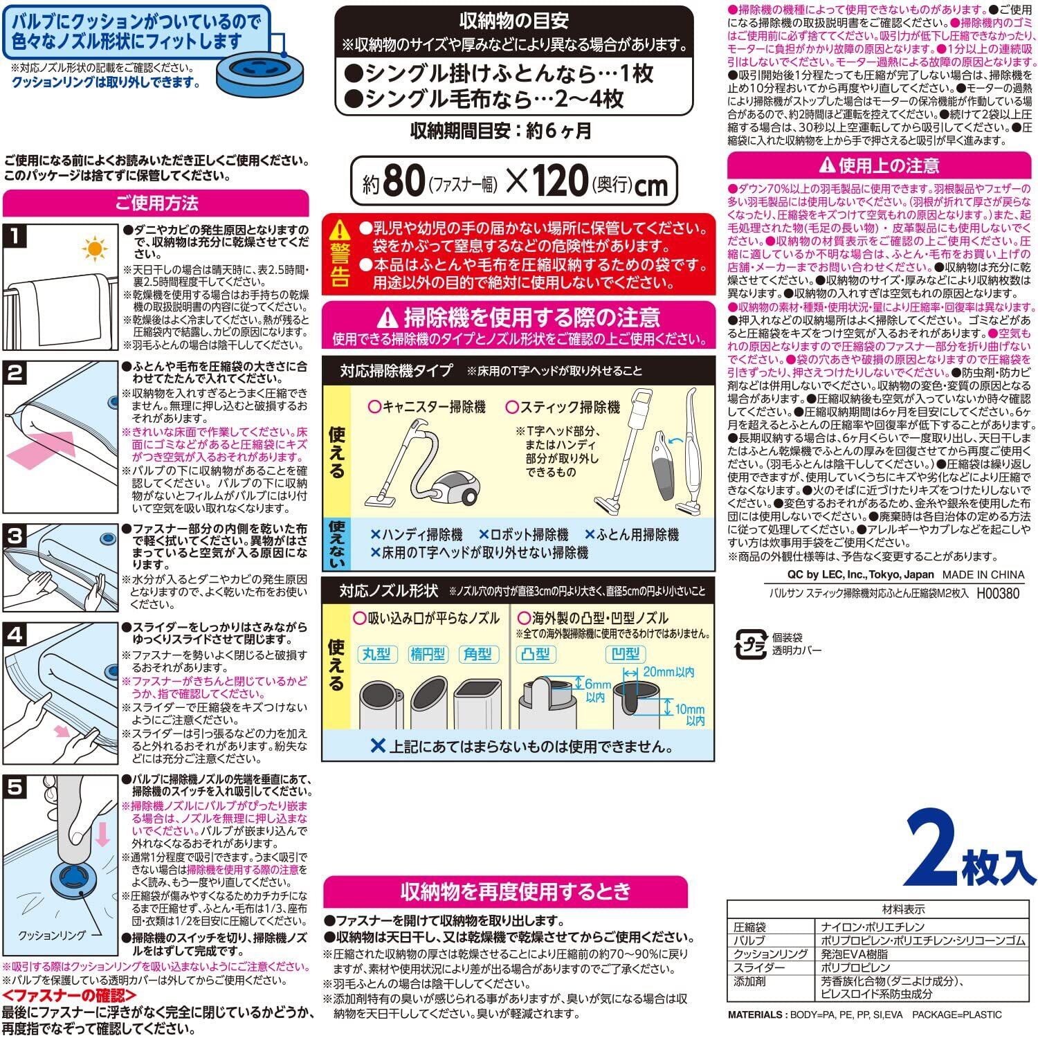 レック(LEC) バルサン スティック掃除機対応 ダニ除け・防虫加工 ふとん圧縮袋 Mサイズ (2枚入) /目安:セミダブル掛けふとん1枚/ふつうの掃除機もOK/H00380