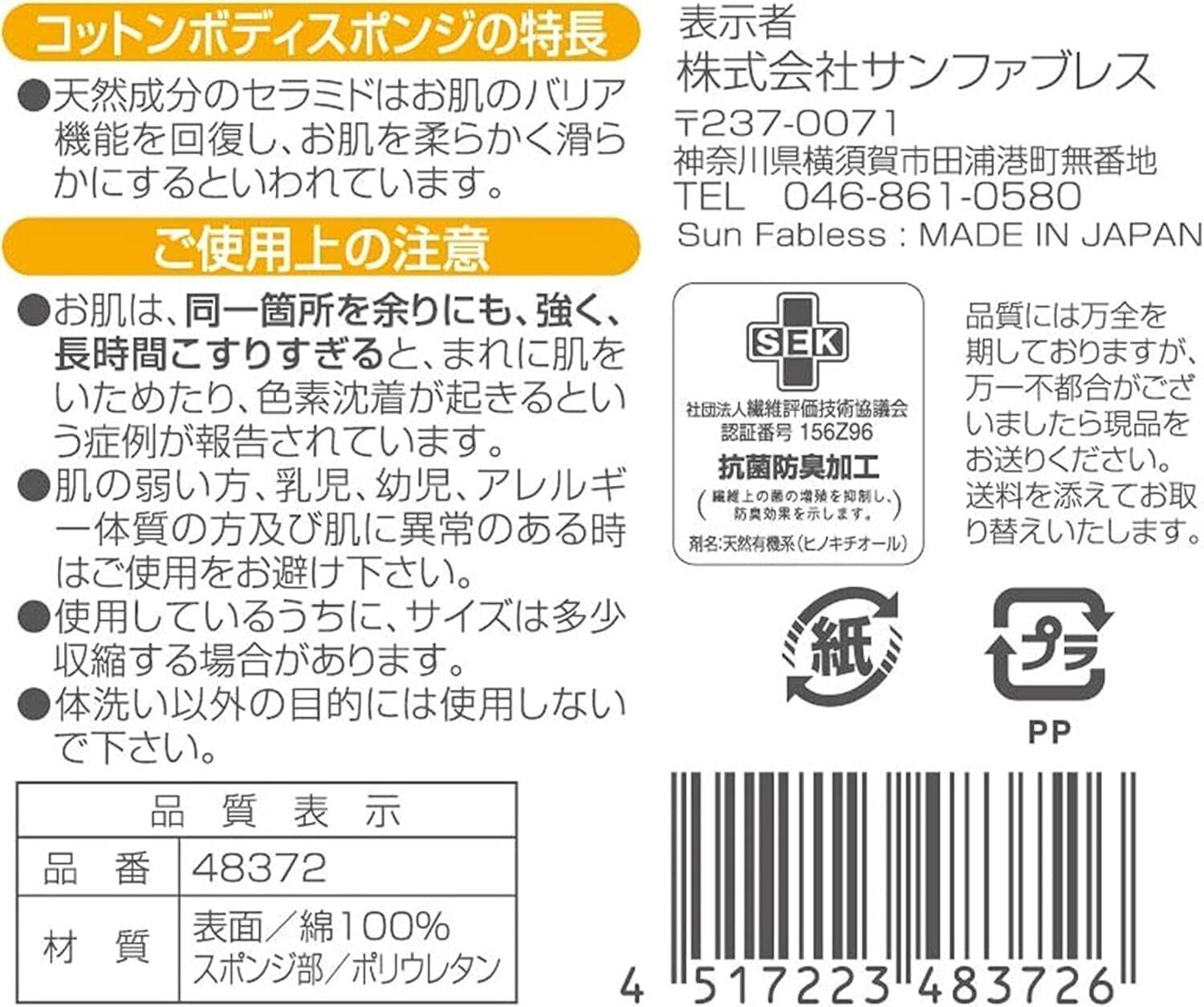 柔らかい純綿をボリュームたっぷりに編み上げたボディスポンジです。●天然成分のセラミドはお肌のバリア機能を保ち、お肌を柔らかく滑らかにするといわれています。