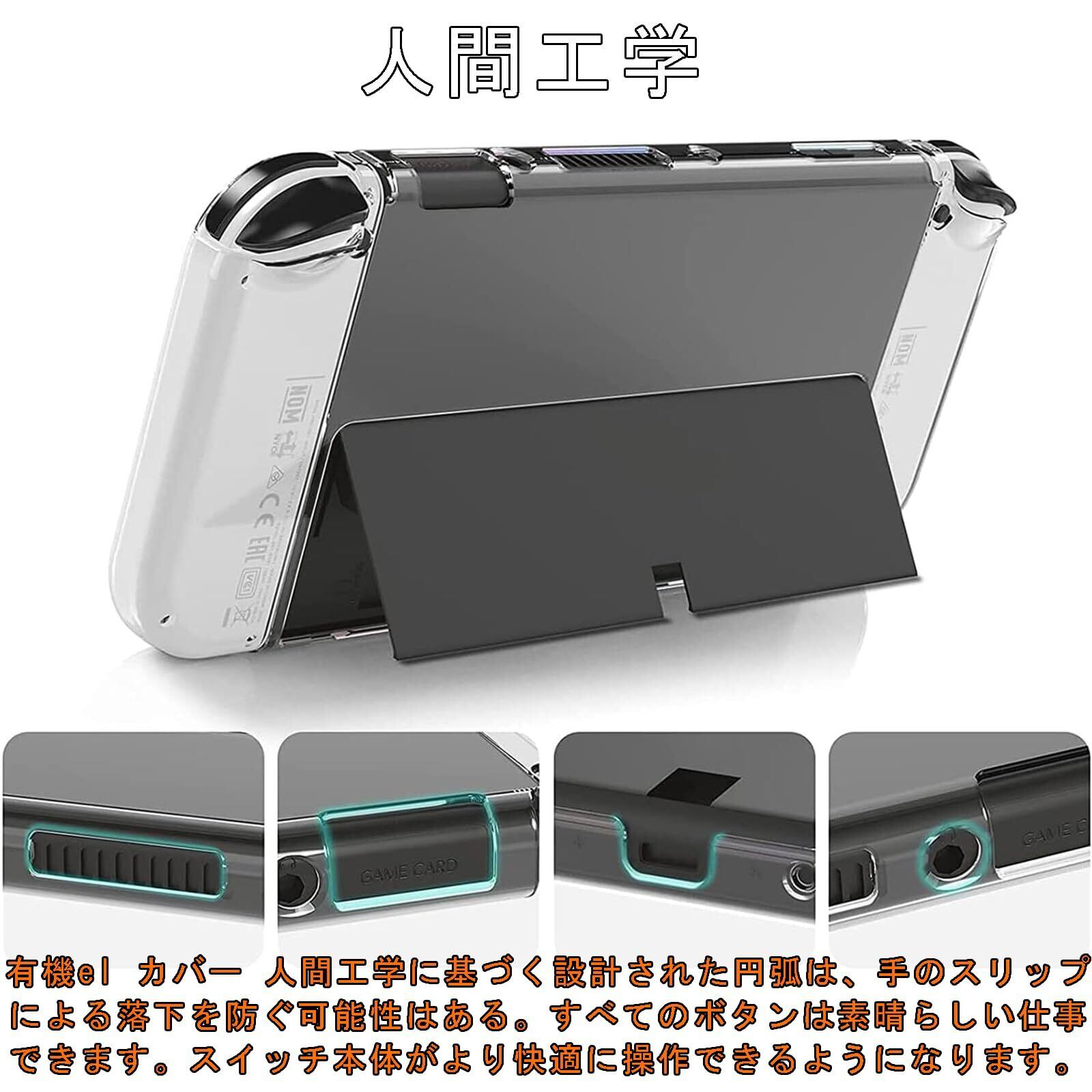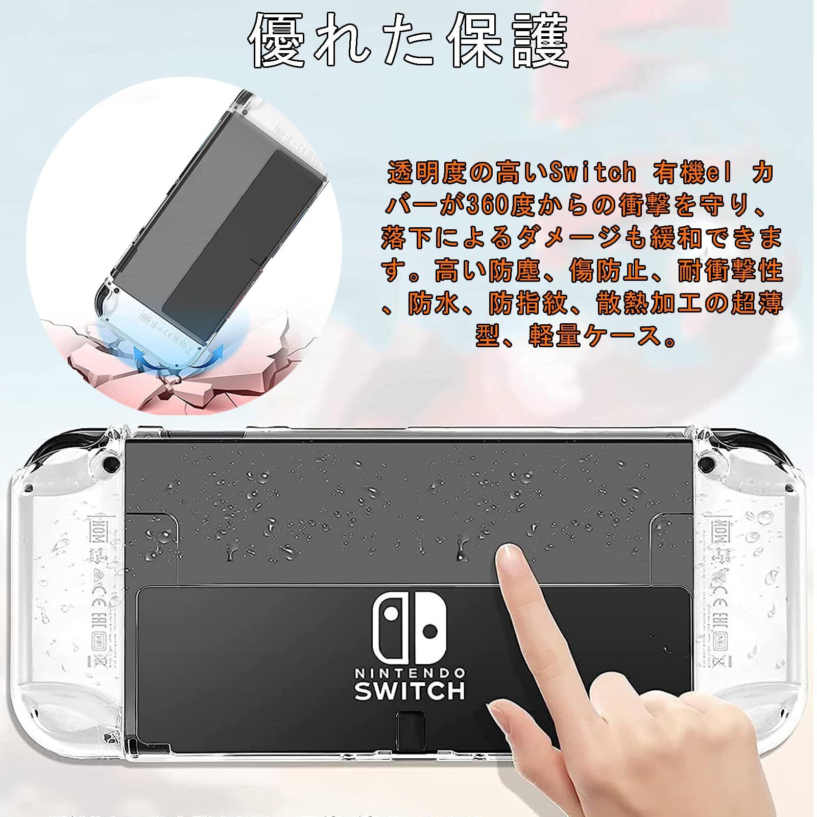 【全新ピッタリ分体式 設計】Switchカバー 高品質材料で作られた、ゴムのようなしなやかな弾力性とプラスチックのような強靭さを合わせ持ちます。耐磨性がよい。優れた放散性能のおかげで、長時間に使用しても熱がこもらず、ゲーム機の温度を効果的に下げて、もっと素晴らしいゲーム体験を提供します。分体式ケースはゲーム機を個別に保護することができます。 【黄ばんなし*高級感あり】switch有機elカバー ソフトな素材、透明の色なので、黄ばんまなし、3Dデザインにより、ソフトで優しく温もりのある特殊な3層コーティング仕上げを実現し、サラサラとした手触り心地と同時に、このデザインは誰でもピッタリ合う。透明、シンプル、Switch Oledの本来の美しさを誇示します。 【人間工学*優れた保護】有機el カバー 人間工学に基づく設計された円弧は、手のスリップによる落下を防ぐ可能性はある。すべてのボタンは素晴らしい仕事できます。スイッチ本体がより快適に操作できるようになります。透明度の高いSwitch 有機el カバーが360度からの衝撃を守り、落下によるダメージも緩和できます。高い防塵、傷防止、耐衝撃性、防指紋、散熱加工の超薄型、軽量ケース。 【高品質素材*着脱簡単】本製品は分割型の設計を採用して、高品質の柔軟なTPU素材を使用して、取り付けと取り外しを繰り返しても本体にキズ付きにくいです。耐磨性と耐汗性が抜群で、長時間に使用してもスイッチカバーは発汗や発熱はありません。switch 有機el 保護カバー 新しい超薄デザインで、着脱簡単。 【機種対応】Switch有機elモデル専用に特別に設計されたクリスタルケースです。新型Nintendo Switch Oled有機elモデルに対応します。このケースは丈夫で軽量で、Switch OLEDを傷から守ります。SWITCH OLEDケースの背面は、保護機能を備えながらブラケットで開いて自由に調整できます。
