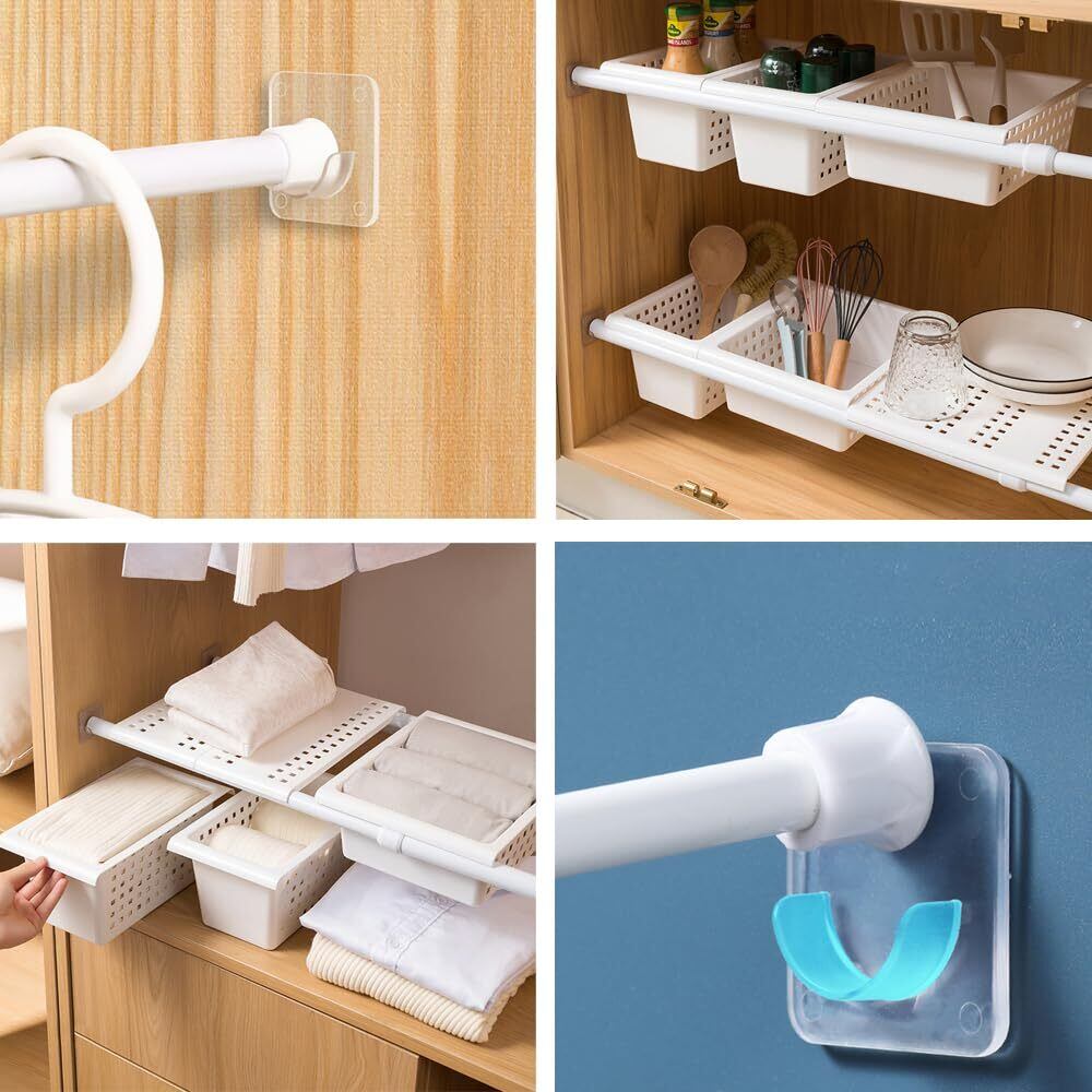 【強力な粘着剤】私たちの伸縮バーのスタンドは、強力な粘着剤を採用しており、しっかりとサポートが固定されます。ガラス、タイル、ステンレス鋼などの滑らかな表面でも、伸縮バーをしっかりと固定し。