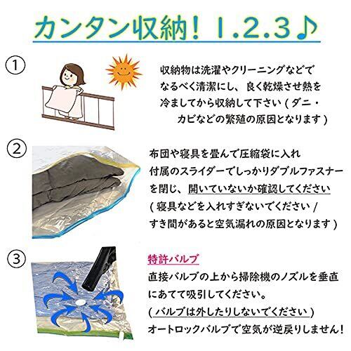 掃除機でカンタン!特許 自動ロック スピードバルブ + 二重ファスナー付き/カンタンに手早く圧縮できる便利な圧縮袋のお得セット。手押しでも圧縮できるので、小さなポンプで空気を抜く手間が不要!(手押しのみでの圧縮は時間がかかりますので、掃除機との併用をおススメ致します) 中身が見えて取り出し時も便利。