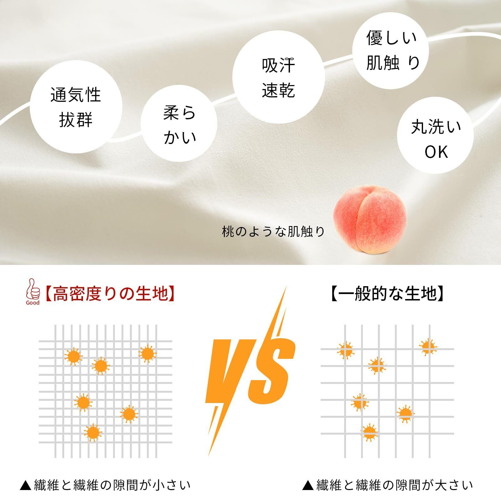 <ふわふわ柔らかな肌触り>:生地の表面の繊維を毛羽立たす加工を施したピーチスキンのおかげで、触れた瞬間にサラサラ、ふわふわっとした柔らかい肌触りになります。すごく心地よいです。