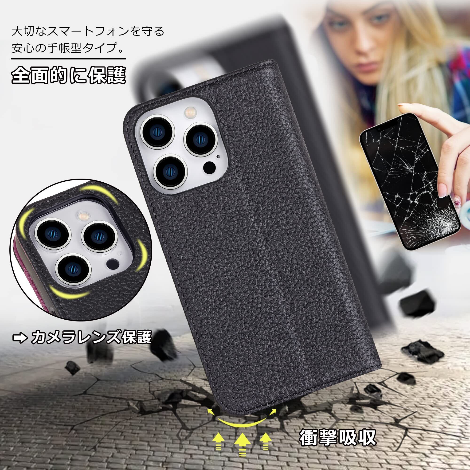 iPhone15 Pro対応・本革素材手帳型ケース:背面だけでなく、画面を覆っているため、画面から直接地面に落ちる場合は、スマホの画面を保護してくれるので安心といったイメージがあります。カバーの面積が広くなり、カバーの外側や内側を有効利用できる点も手帳型の魅力の1つでしょう。カバーの内側にポケットがあり、カード型のものを収納しておけます。定期やクレジットカードといったものは、生活する上で頻繁に使います。