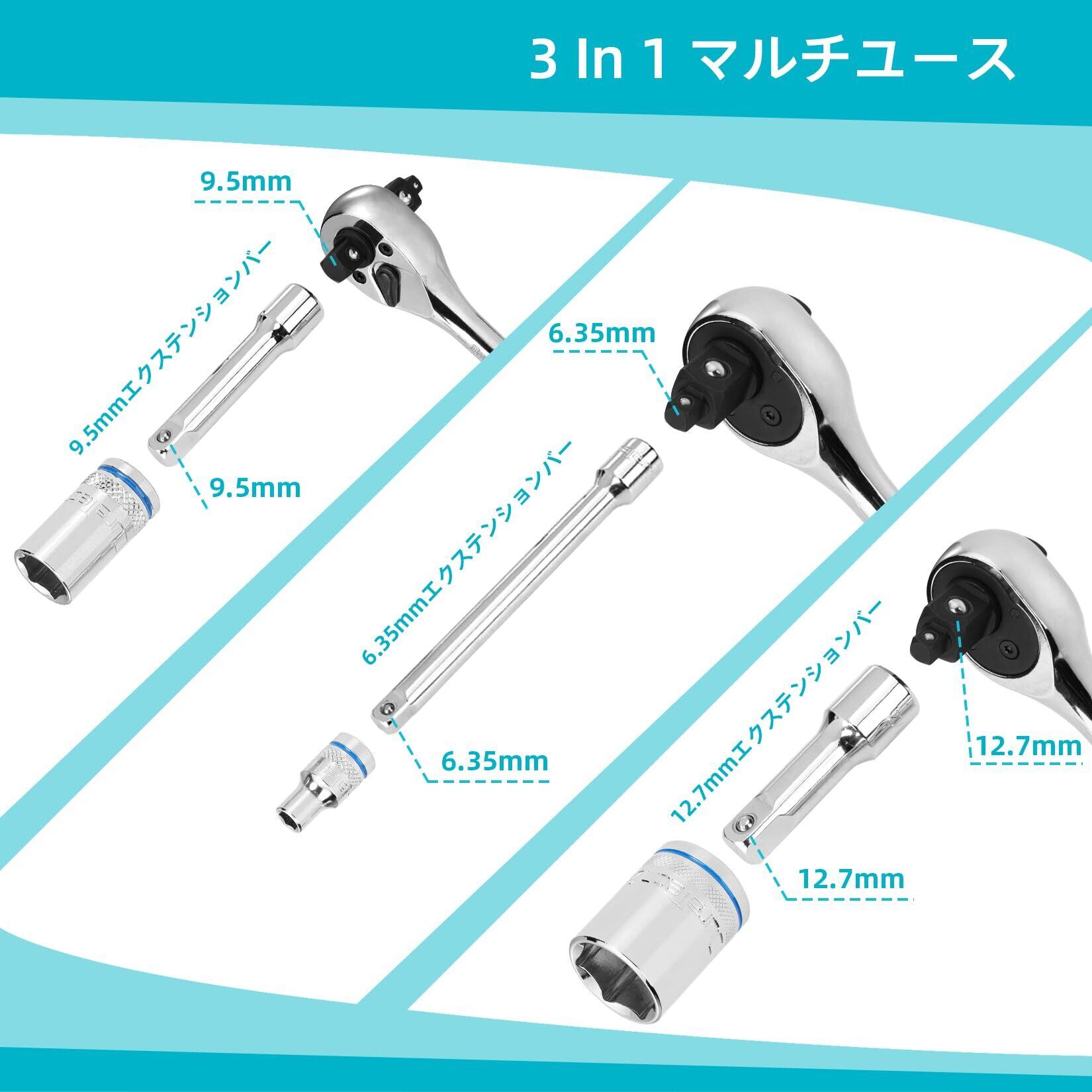 【セット内容】統計24PCのソケットレンチセットです。(差込角6.35mm,差込角9.5mm,差込角12.7mm)3IN1ラチェットハンドル×1、(差込角6.35mm)99mmエクステンションバー×1、(差込角9.5mm)73mmエクステンションバー×1、(差込角12.7mm)71mmエクステンションバー×1、差込角6.35mmソケット×13pc(4、4.5、5.5、6、7、8、9、10、11、12、13、14mm) 、差込角9.5mmソケット×4pc (16、17、19、21mm) 、差込角12.7mmソケット×3pc (22、24、25mm) 。
