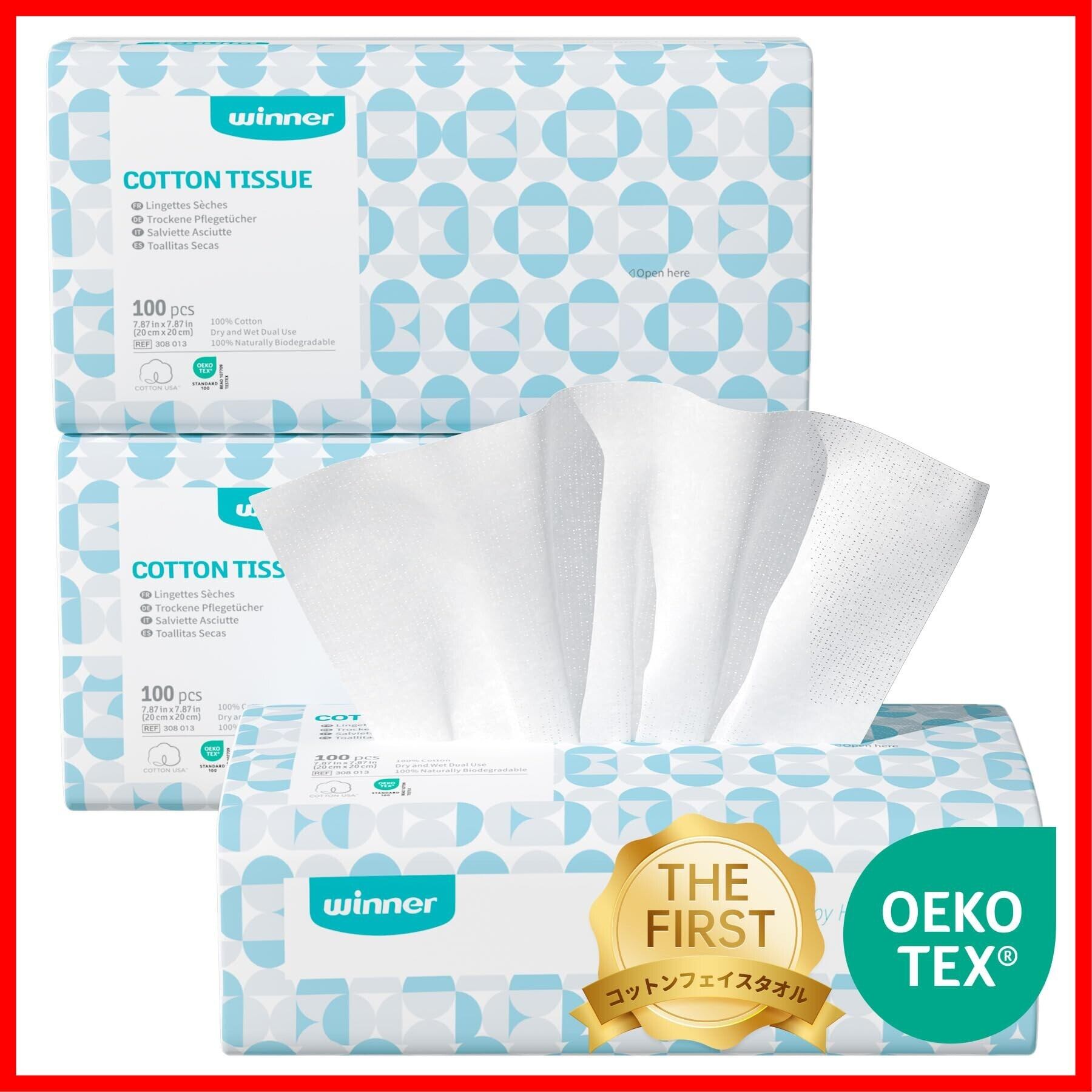 Winner フェイスタオル クレンジングタオル OEKO-TEX®認証 300枚入り(100枚×3個セット) 天然コットン ふきとり用 フェイスペーパー 毛羽立ちなし 使い捨て 手拭き 顔拭き メイク落とし 敏感肌用 乾湿両用 20x20cm