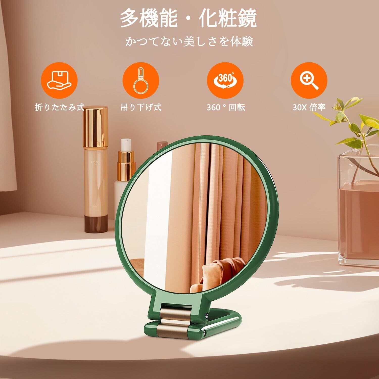 Auxmir 手鏡 化粧鏡 拡大鏡 30倍と等倍 折りたたみ式 ハンド&スタンドミラー 吊り下げ式 卓上/吊り下げ/手持ち可能 持ち運び便利 鏡 卓上 コンパクト 軽量 旅行用 ハンドル付き両面鏡 円形 緑色 プレゼント | hananoki