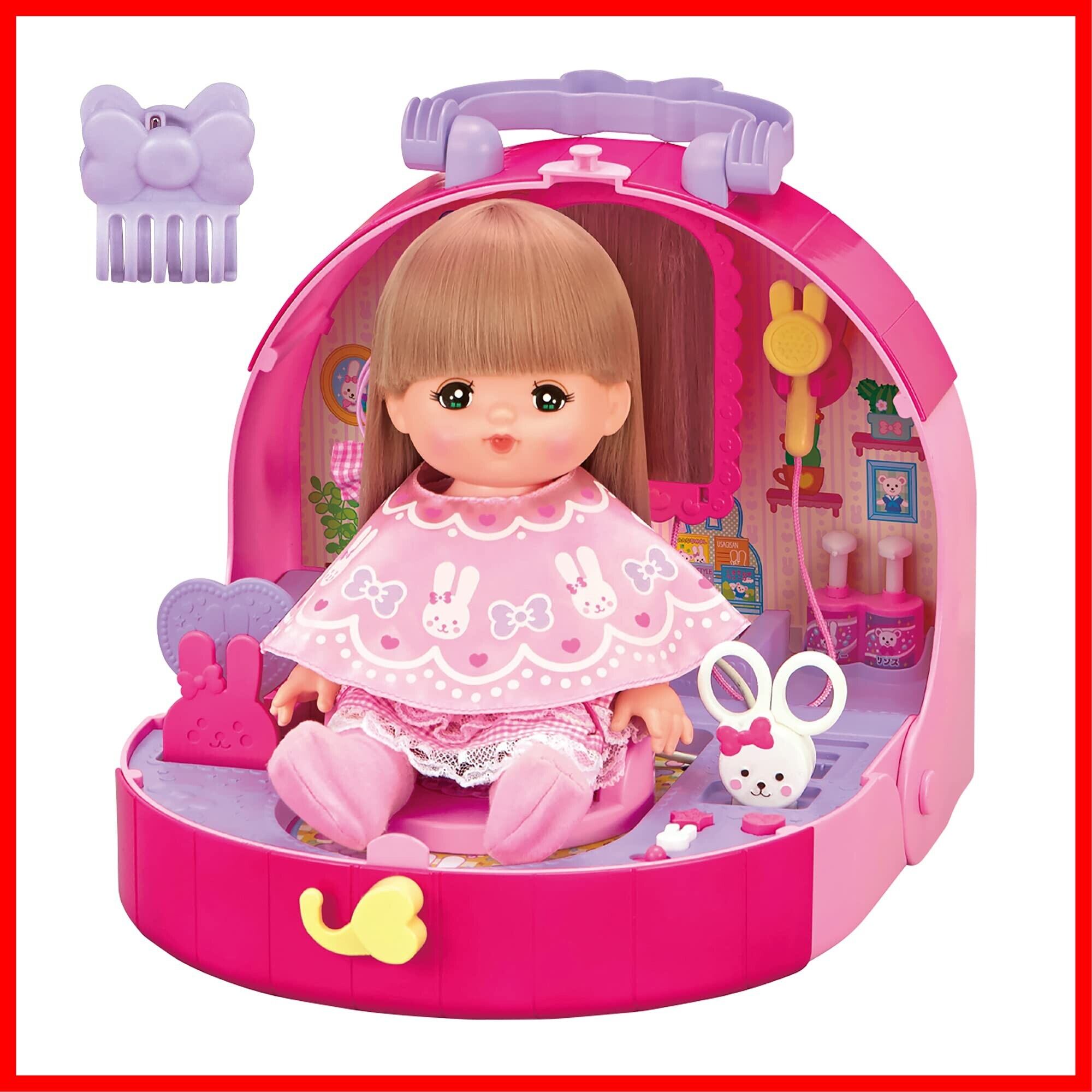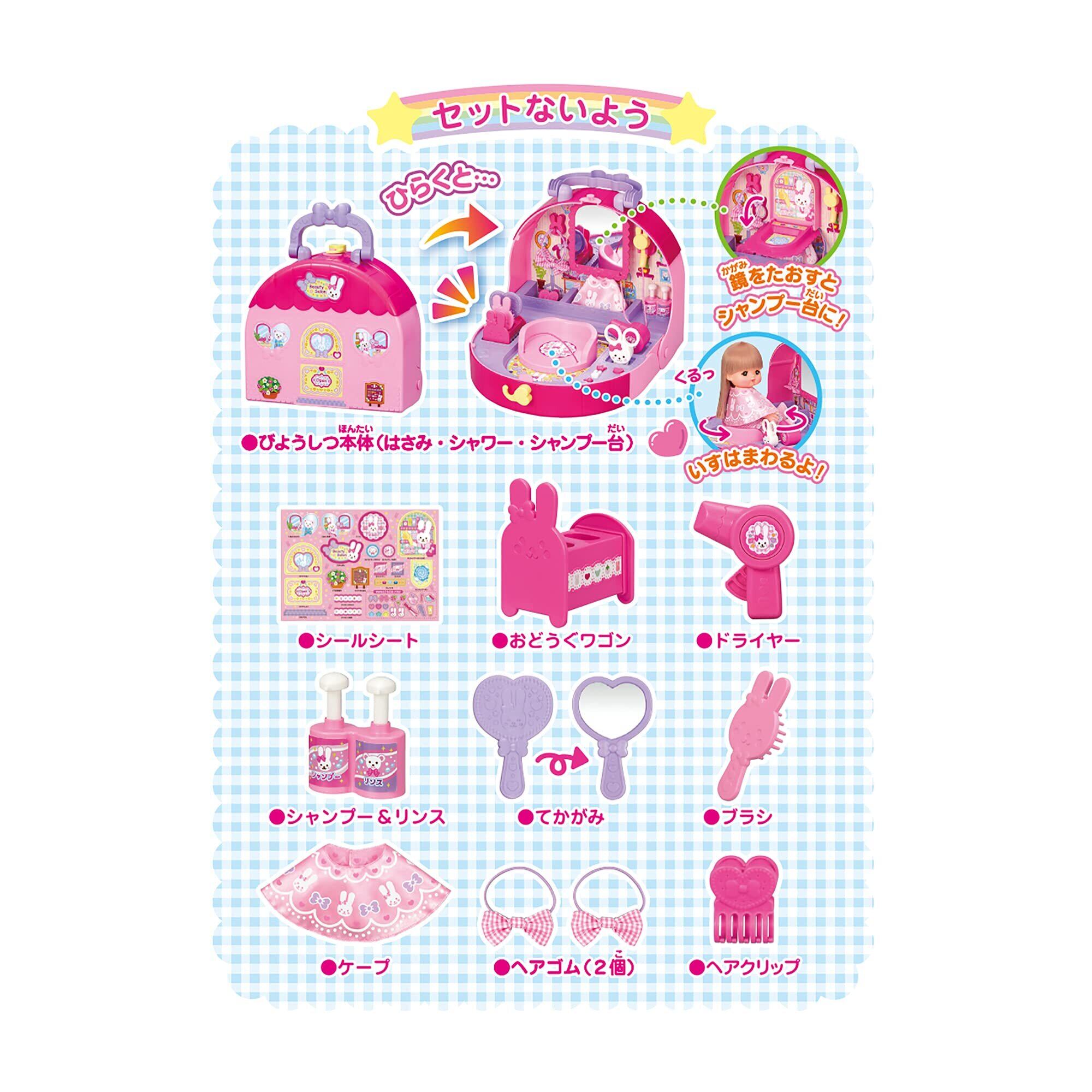 リボンクリップ付きのメルちゃんのうさぎさんびようしつ。<br>ボタンを押したりハサミを開閉すると、シャワーやドライヤーの音が鳴ったり店員さんの声が流れたりと、楽しい機能がいっぱいです。<br>小物の種類も豊富で、びようしさんになりきって楽しく遊ぼう。<br>単3電池×2本使用(別売)