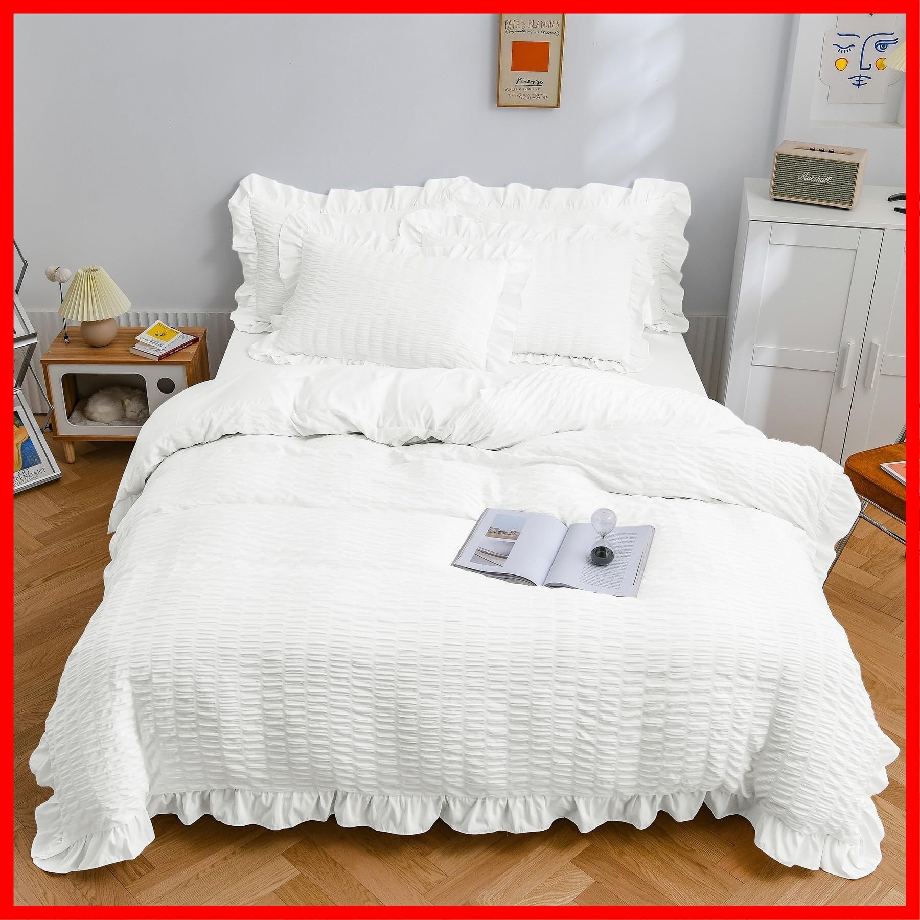 布団カバー AYO セミダブル・4点セット シアサッカー生地 フリル付き 掛け布団カバー ベッドカバー 枕カバー ボックスシーツ 寝具カバーセット ピーチスキン加工 洋式和式兼用 洗い替え 速乾タイプ(ホワイトセミダブル・4点セット) | hananoki