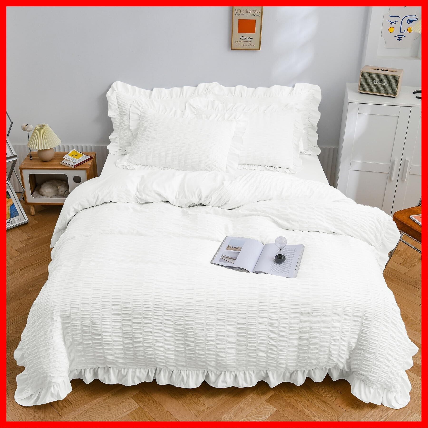 布団カバー AYO セミダブル・4点セット シアサッカー生地 フリル付き 掛け布団カバー ベッドカバー 枕カバー ボックスシーツ 寝具カバーセット ピーチスキン加工 洋式和式兼用 洗い替え 速乾タイプ(ホワイトセミダブル・4点セット)