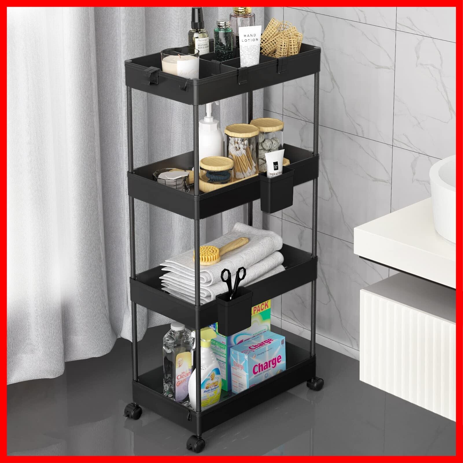 SPACEKEEPER キッチンワゴン 隙間収納 スリム 22cm 収納カップ 仕切板付き 多機能 小物 食品 調味料 キャスター付き 組立簡単 浴室 台所 冷蔵庫横 4段 ブラック