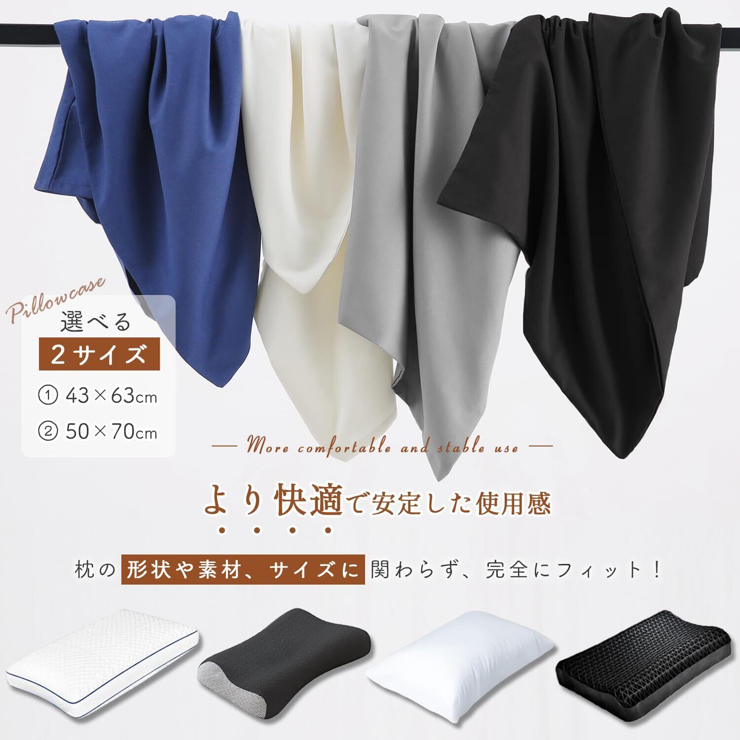【選べるサイズ&おしゃれな4色展開】お使いの枕に合わせて選べる2サイズ(43×63cm / 50×70cm)。落ち着いたニュアンスカラーの4色をご用意し、どんなインテリアにも上品にマッチ。寝室の雰囲気に合わせてお好きなカラーをお選びいただけます。同シリーズの掛け布団カバーやボックスシーツと組み合わせて、統一感のあるコーディネートも楽しめます。