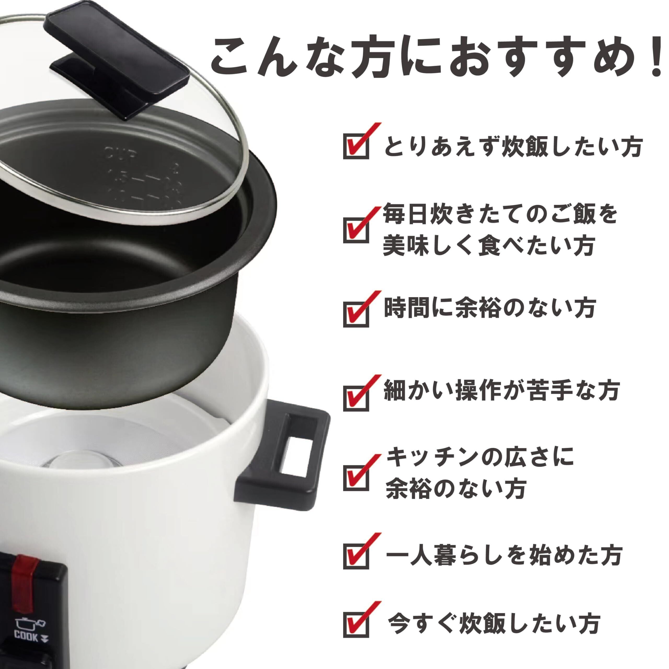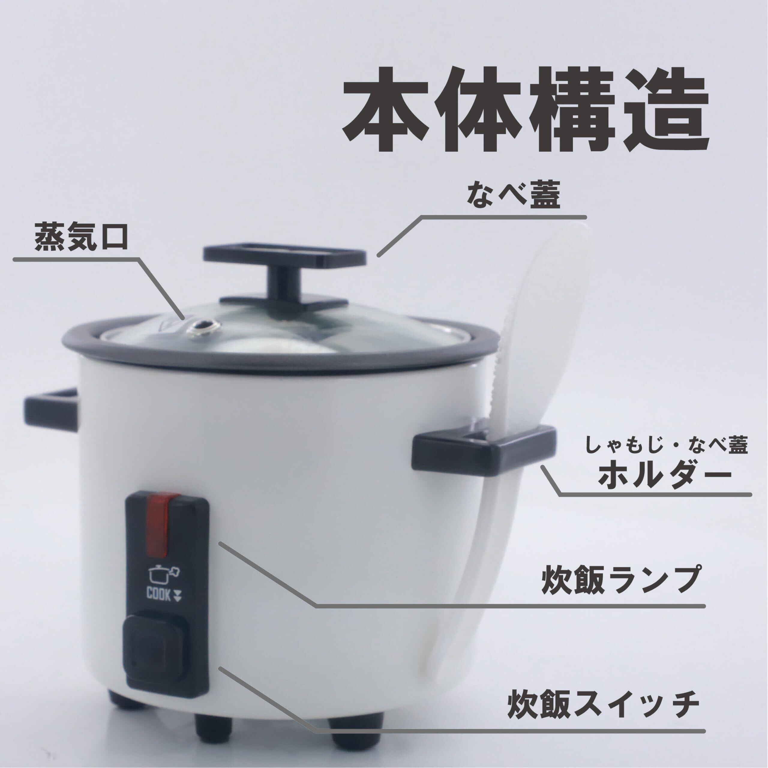 ・電源:AC100V 50/60Hz共用 ・消費電力:200W ・炊飯容量:0.5~1.5合 ・本体サイズ:約200(W)×168(D)×171(H)mm ・質量:約0.97kg ・付属品:計量カップ、しゃもじ
