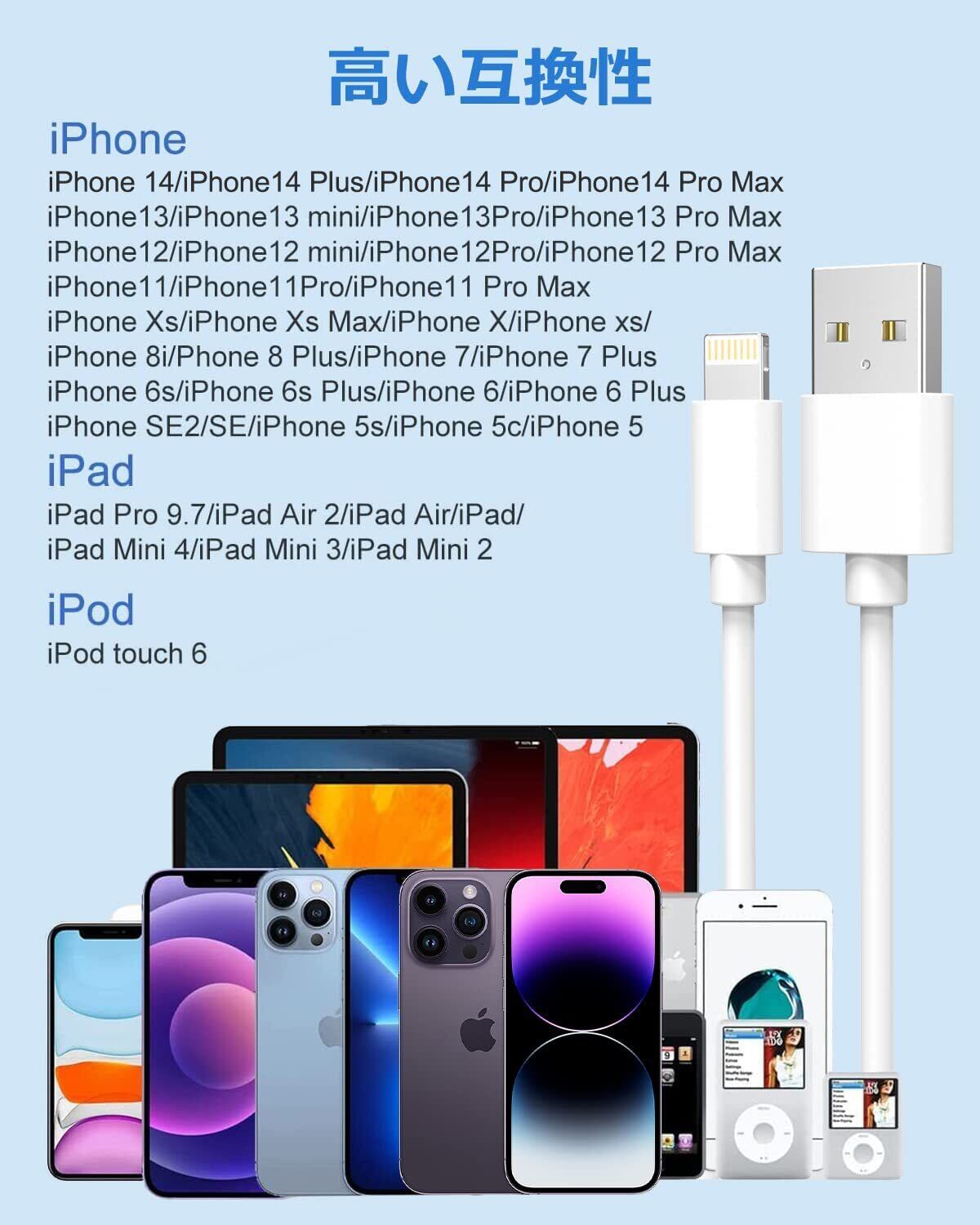 完全な互換性:すべてのiPhoneデバイスの高速充電とデータ転送をサポートします。iPhone 14/14 Plus/14 pro/14 Pro Max/iPhone 13/13 pro/13 Pro Max/12/12 Pro/11/XS/XR/SE/iPad/Air podsなどに対応できます。